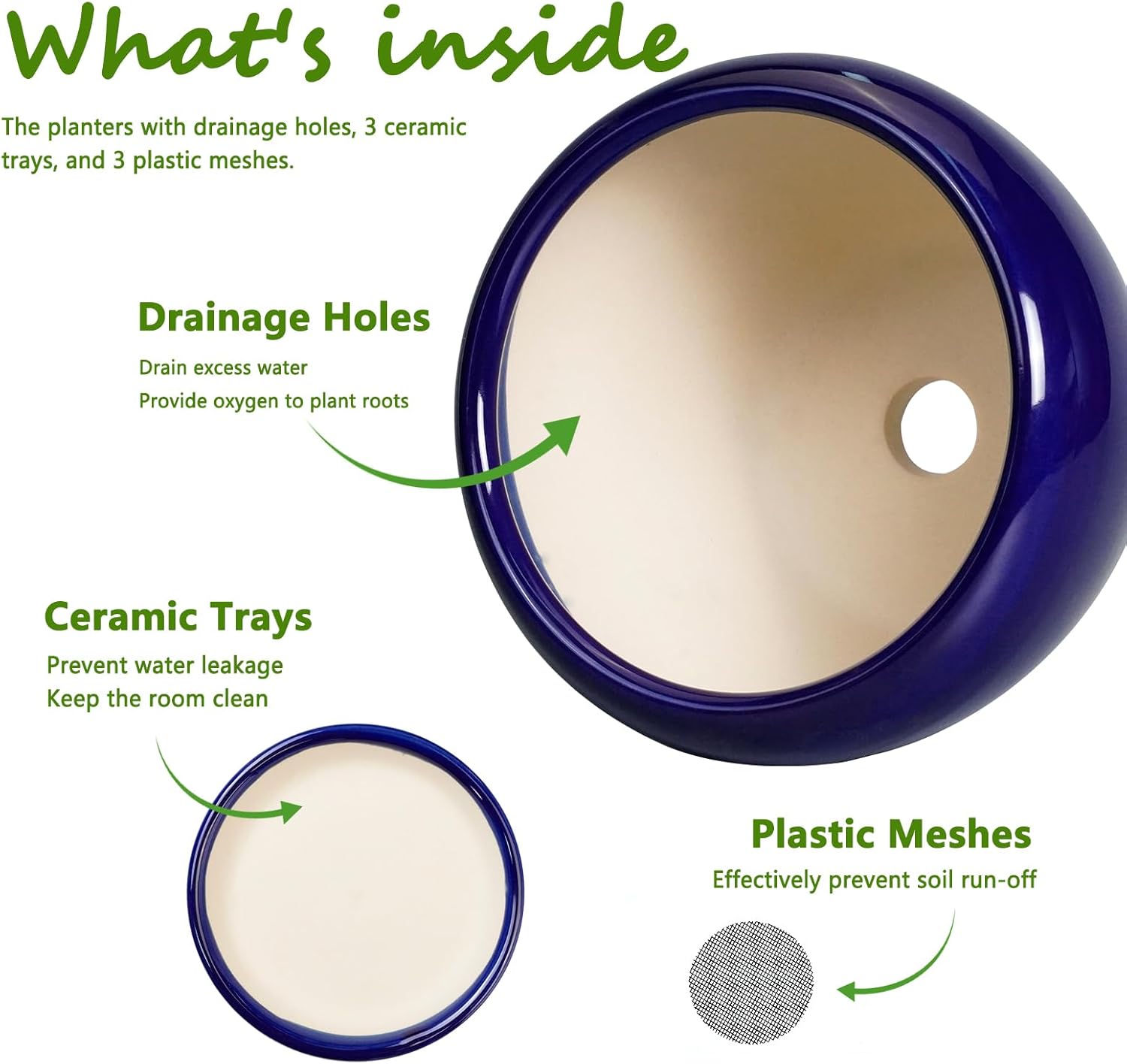 - Drainage Holes and Accessories: Each ceramic plant pot has a drainage hole at the bottom, a mesh, and a ceramic tray for collecting water. This will provide ample oxygen to the plants