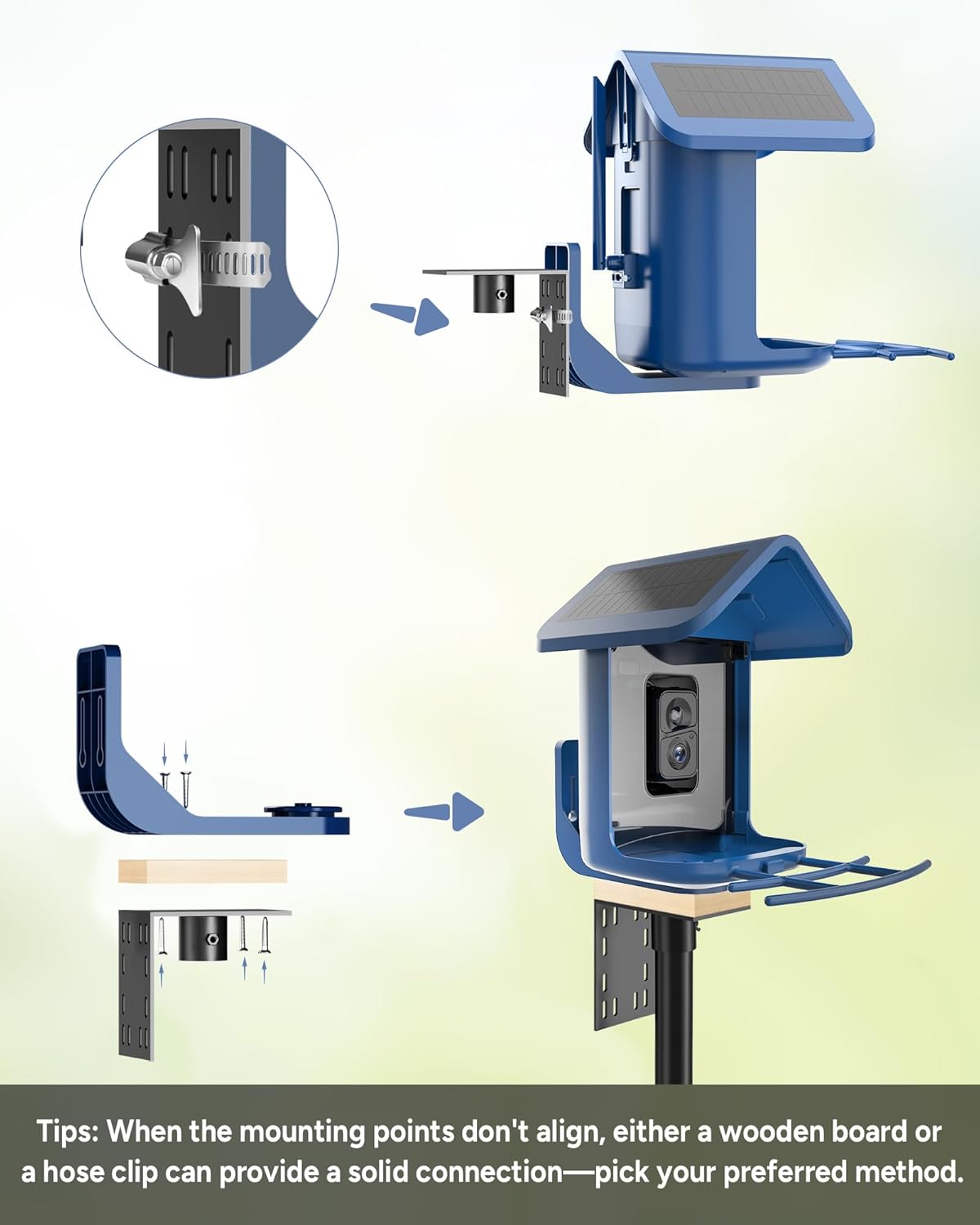 - 【Universal Compatibility with Bird Feeder】This bird feeder pole is compatible with most bird feeder cameras. The L-shaped plate is perfectly designed for our Onlyfly bird feeder. For other bird feeders, we provide a bridging solution with a wooden board. Simply attach the bird feeder to the wooden board and secure it to the L-shaped plate using nails for a stable installation. Additionally, we offer separate adapters (sold separately) that are fully compatible with Bird Buddy installations.