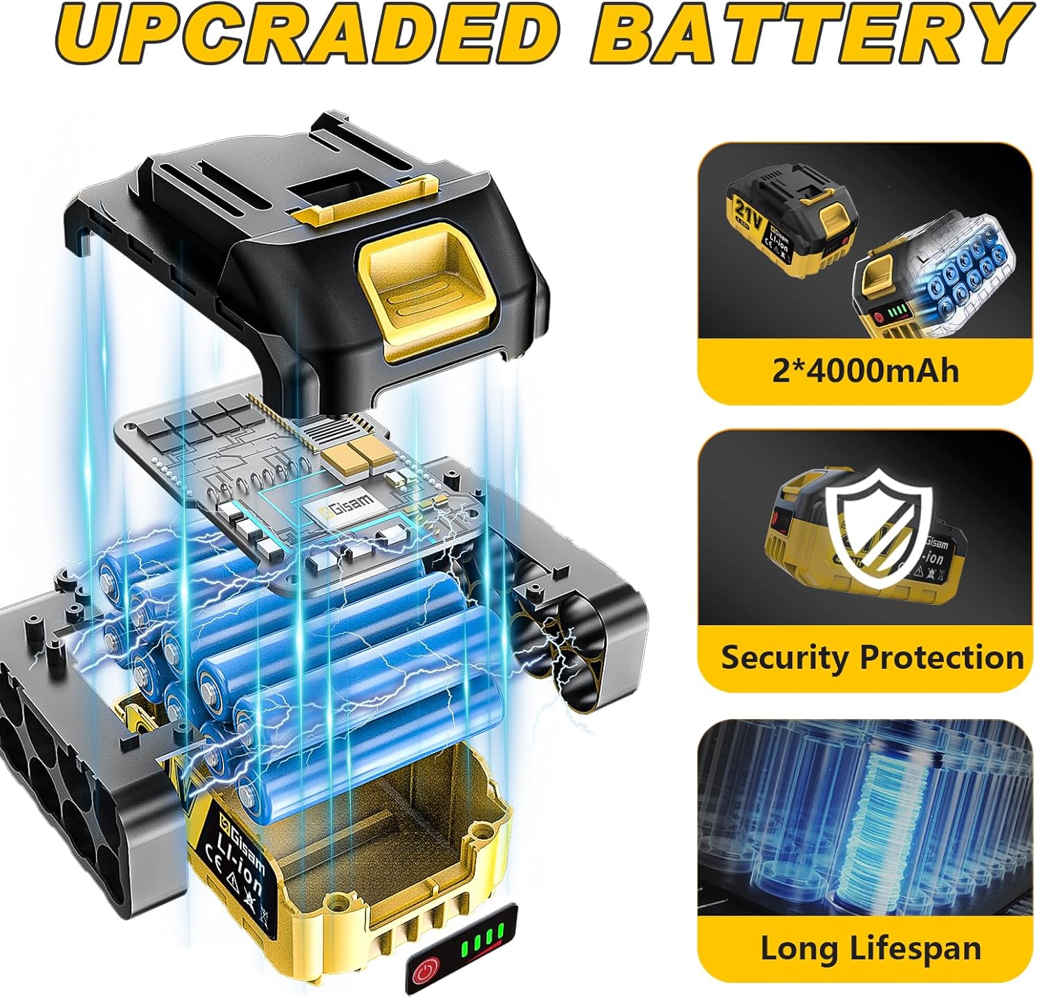 - Longlasting Running Time: With 2 * 21V 4.0Ah battery, the Gisam electric chainsaw lasts 3-4 times longer than a 2Ah chainsaw. The fast charging can fill up in 2 hours with up to 100 minutes of battery life, virtually eliminating interruptions.