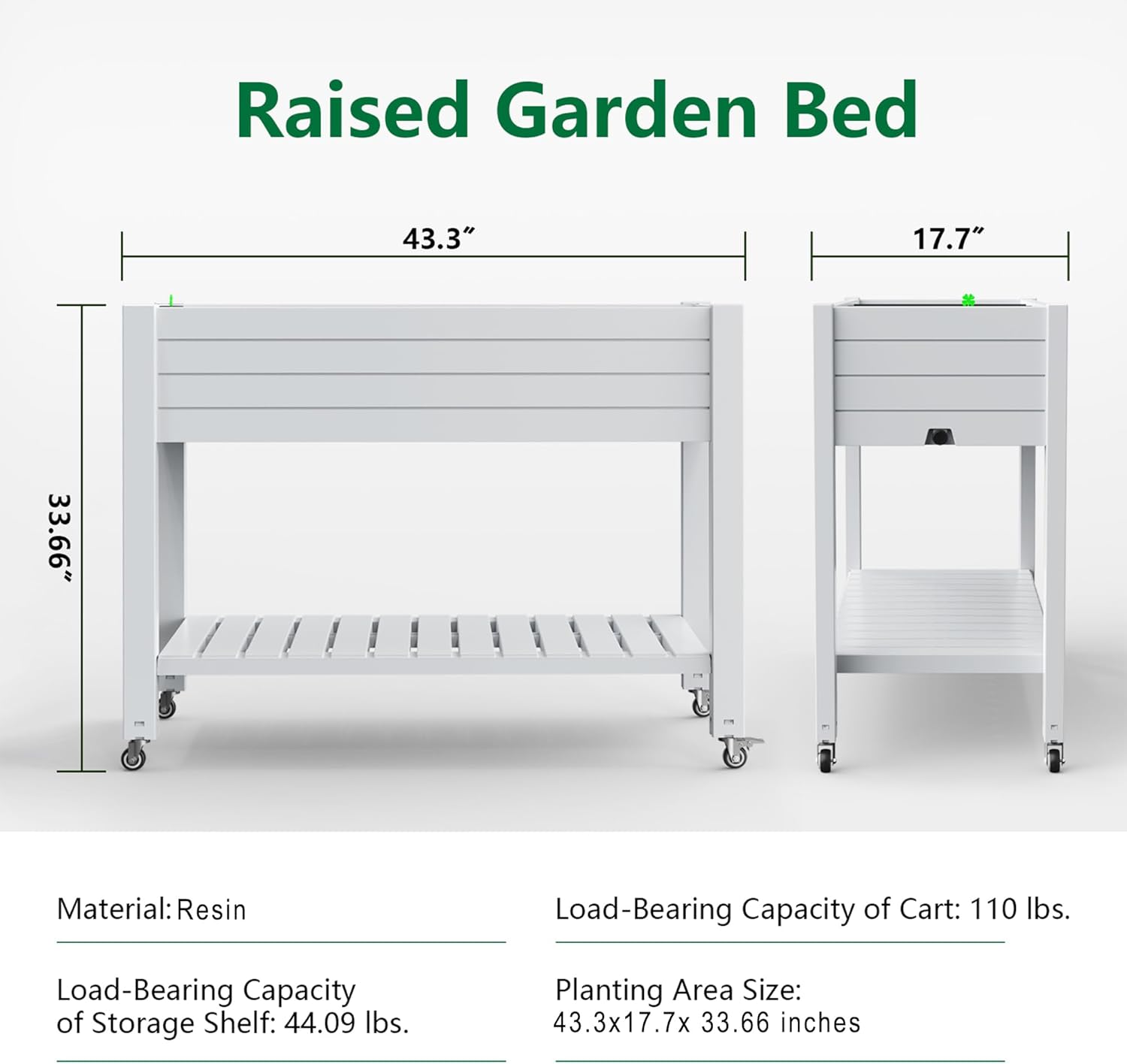 - SPACIOUS PLANTING AREA: Featuring a 43.3"(L) x 17.7"(W) x 33.66"(H) planting area, this garden bed offers a 30L capacity for growing flowers, vegetables, succulents, and herbs. With a weight capacity of 110 lbs, it brings vibrancy to your outdoor space.