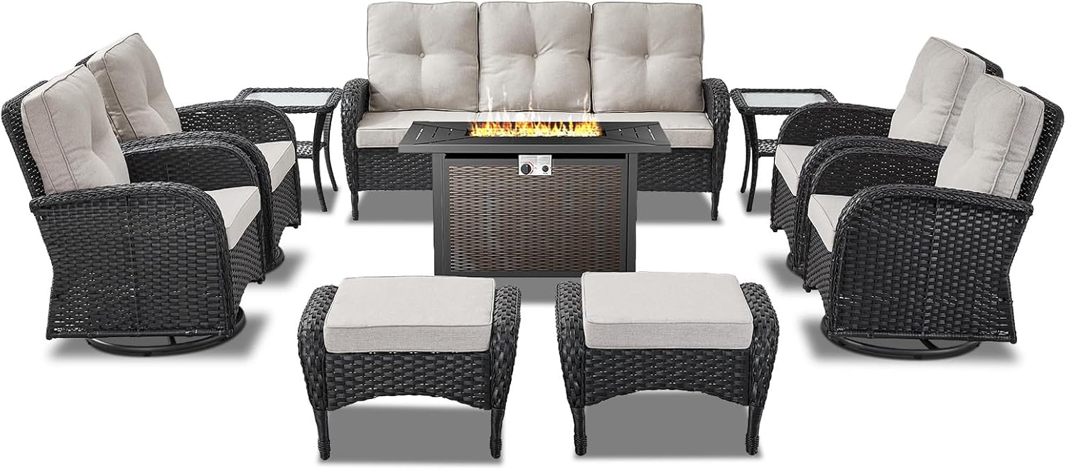 - Complete Patio Furniture Set Details:Transform your backyard into a luxurious retreat with Belord 10-piece outdoor patio furniture set with fire pit table. Featuring a spacious 3 seater sofa, four swivel rocker chairs, two versatile ottomans, two side tables, and a 43-inch fire pit table, this patio furniture set is perfect for hosting unforgettable outdoor gatherings or relaxing evenings.