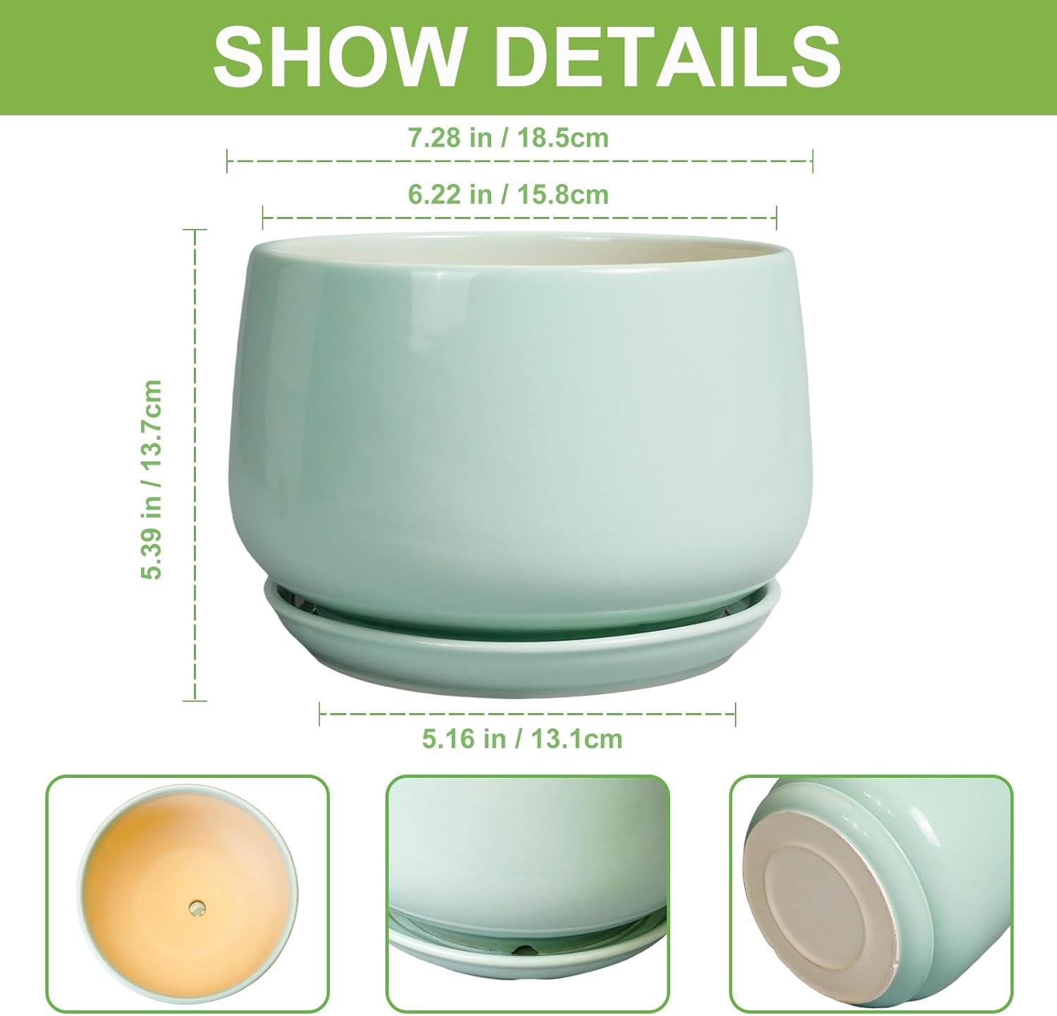 - Dimensions: This ceramic plant pots pit measures 7.28" x 7.28" x 5.39". This round planter is an ideal choice for growing bonsai tree, snake plant, money tree, succulents, cacti, aloe vera, orchids, african violet, geranium plant, peace lily, monstera deliciosa and other indoor & outdoor plants