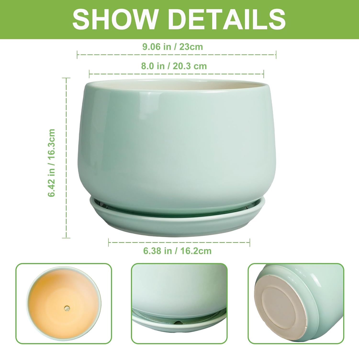 - Dimensions: This ceramic plant pots pit measures 9.06" x 9.06" x 6.42". This large planter is an ideal choice for growing olive tree, bonsai tree, snake plant, money tree, succulents, monstera, cacti, aloe vera, Basil, orchids, geranium plant, pothos, peace lily, ZZ plants and other indoor & outdoor plants