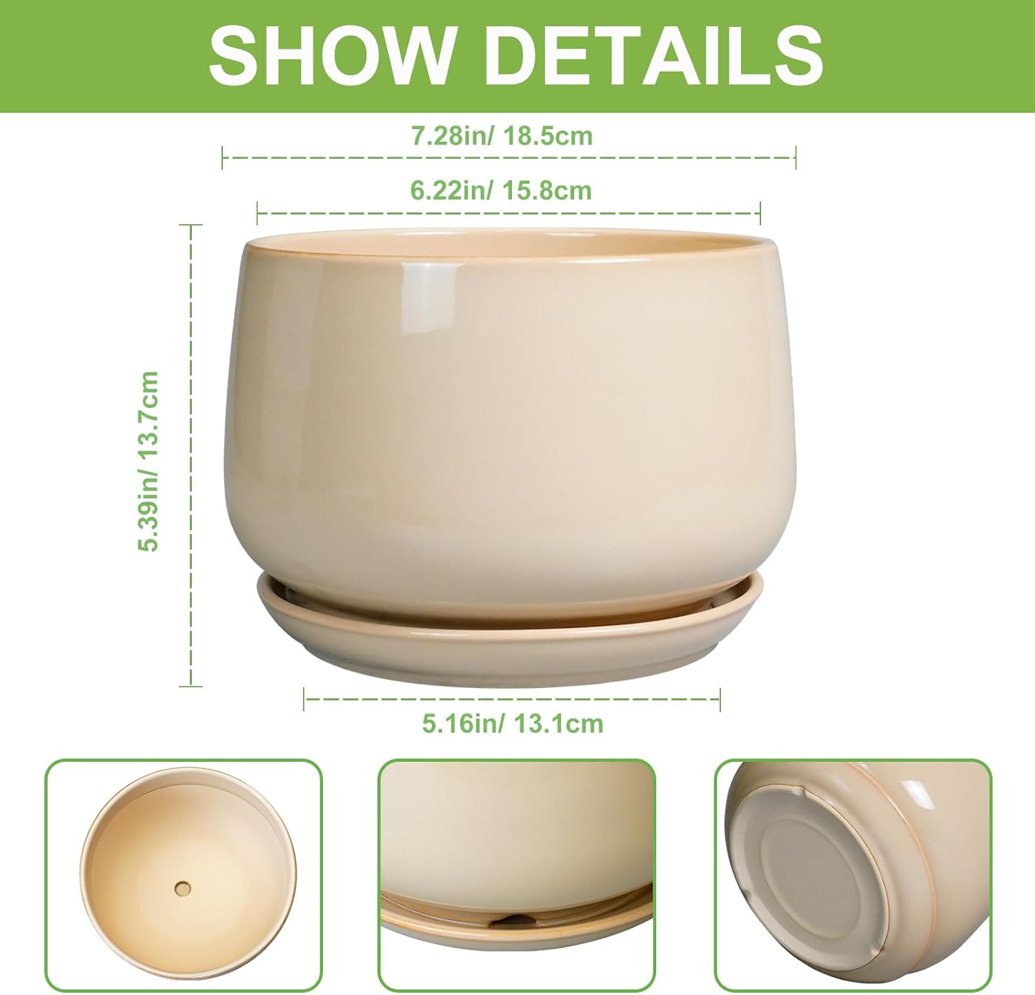 G EPGardening Ceramic Planter - 7 Inch Plant Pots with Drainage and Ceramic Tray, Flower Pots for Indoor Plants, Round Outdoor Planter, Room Decor, Gifts for Plant Lovers, Beige