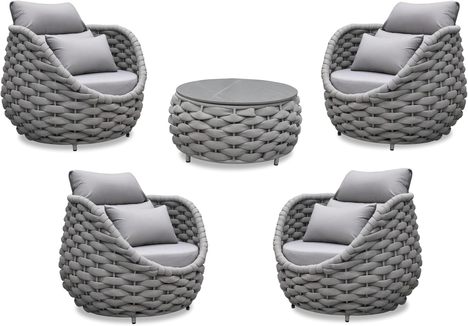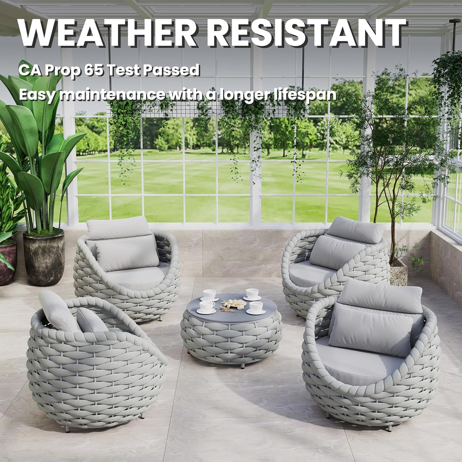 - Furniture set is crafted from reinforced rust-free aluminum alloy frame, wrapped in hand woven textilene rope. The 5 pieces all weather patio upholstered conversation set resists to UV, rain, wind, salt water. Perfect for indoor outdoor even arid or coastal areas