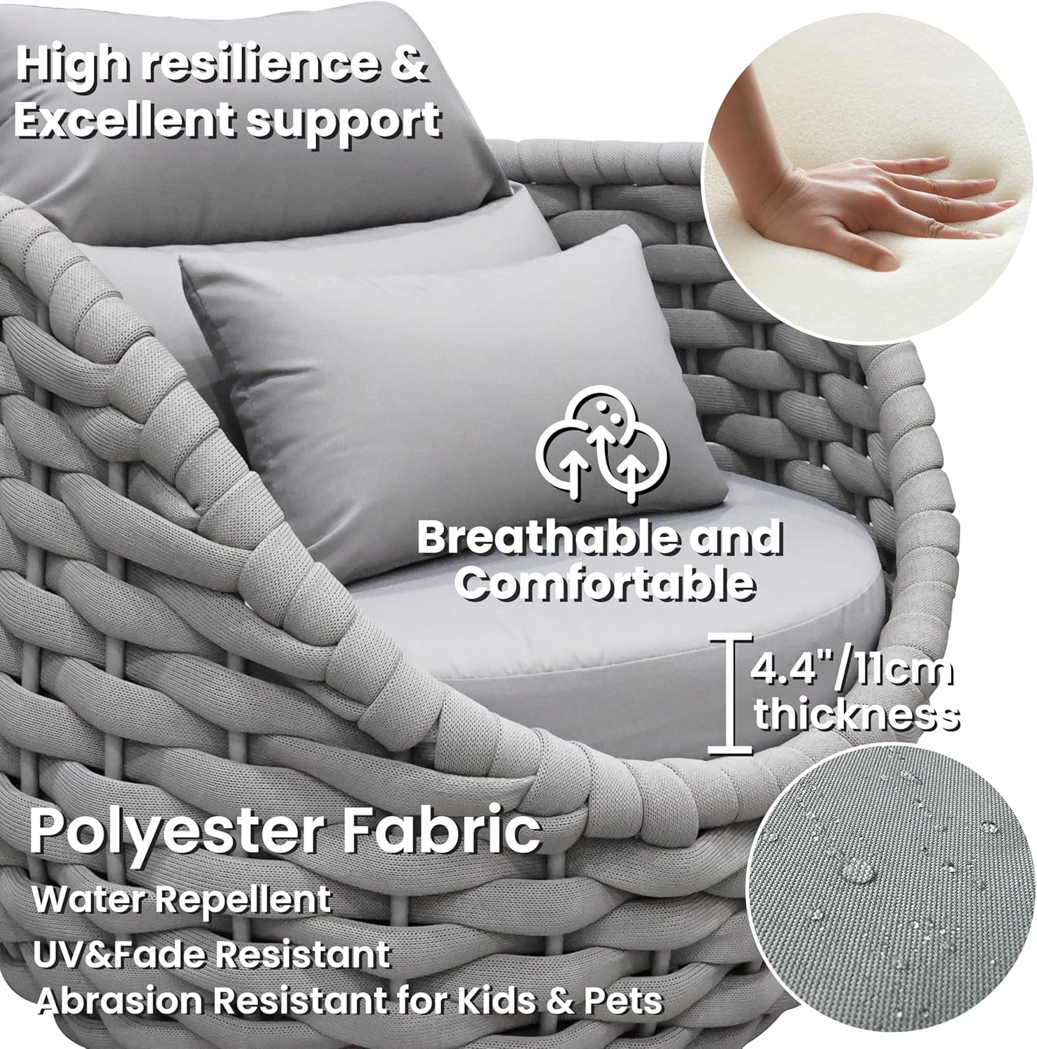 - Filled with 4.3"/11cm thick high-density sponge and cotton, cushions are soft touching and breathable for a refresh comfy patio seating holding its shape in long time using. Water repellent and abrasion resistant polyester fabric also fits families with kids and pets