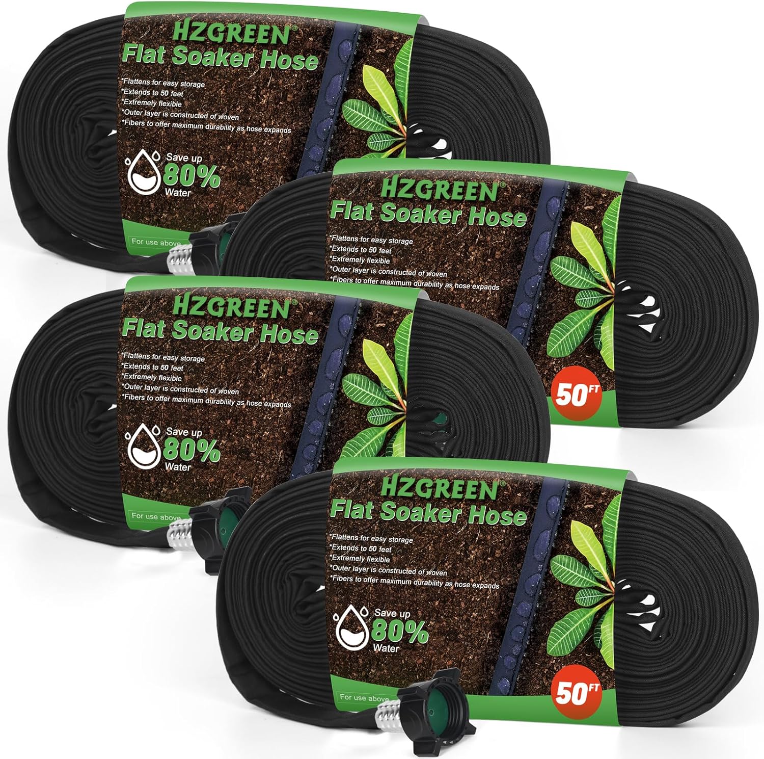 Flat Soaker Hose 50FT x 4 PACK,Drip Hose for Garden Beds Linkable Irrigation System Lightweight and Easy Watering for Tree Plant and Save 80% Water for You (200FT)