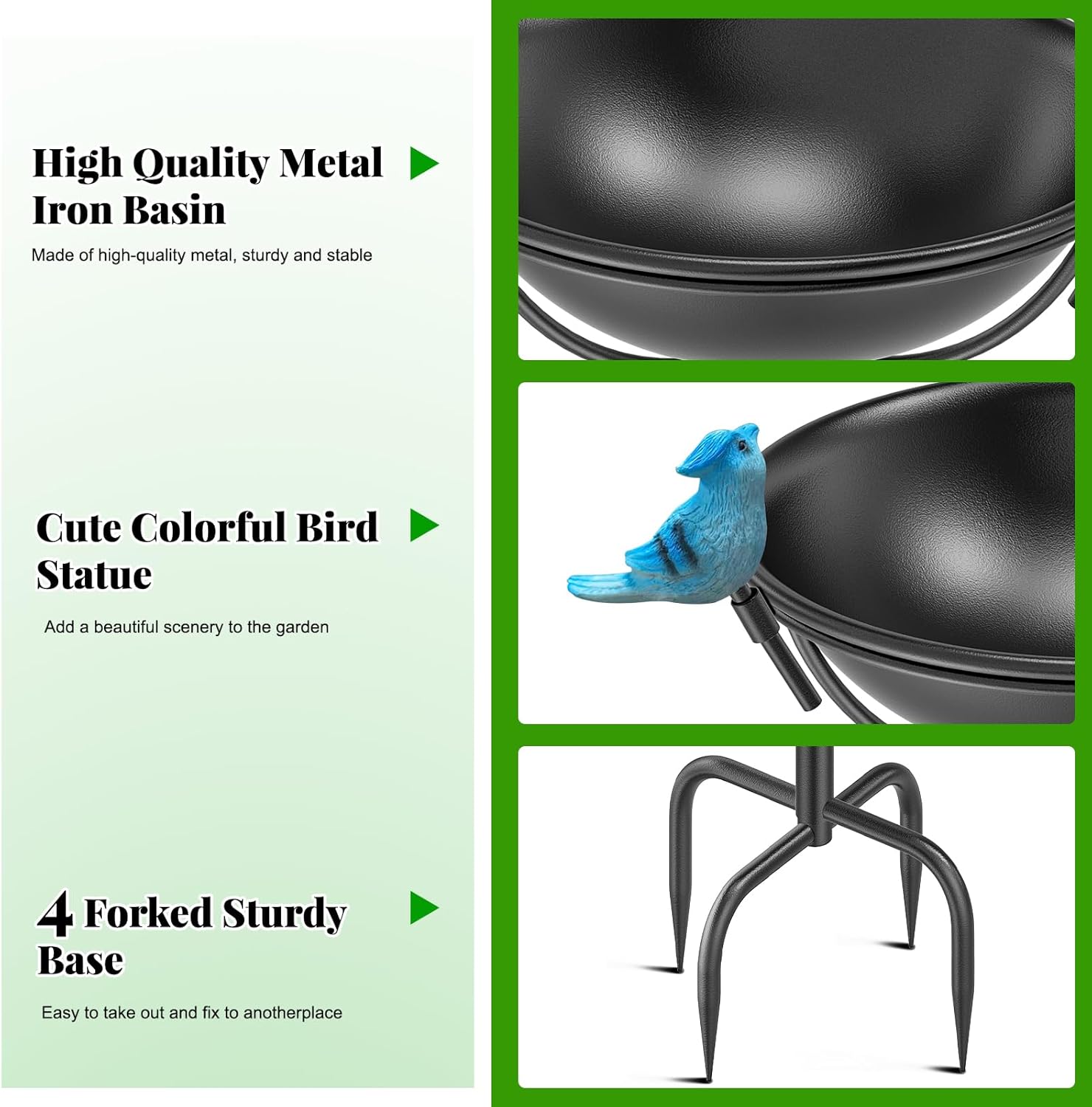 - 【Metal Bird Baths】Our metal bird baths for outdoors are made of high quality metal material and covered with safety coating. Sturdy and durable, windproof and rainproof, not easy to rust, no pungent smell, no need to worry about hurting birds or feathered friends