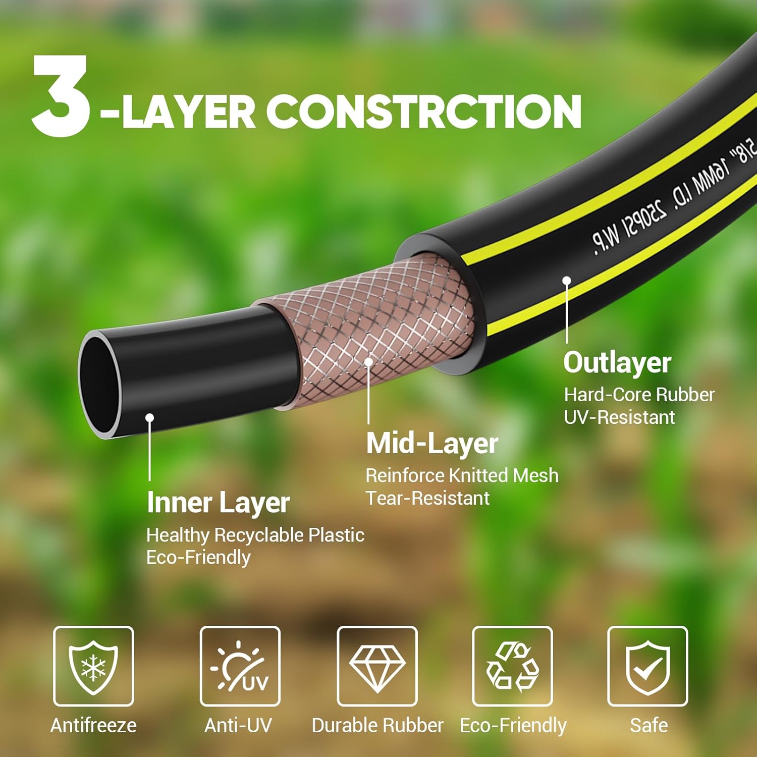 - ๐กใ๐๐๐ซ๐-๐๐จ๐ซ๐ ๐๐ฎ๐๐๐๐ซ ๐๐๐ซ๐๐๐ง ๐๐จ๐ฌ๐ใ: Upgraded premium 3-layers deisgn, OUTLAYER made with hard-core rubber, MID-LAYER made by mesh structure reinforce knitted ensure no tearing&high pressure, healthy recyclable plastic INNERLAYER makes sure water flow clean&smooth. With solid Heavy duty full brass fittings, PHLEX PRO garden hose is life-time durable, Tear-Resistant, UV-Resistant, Weather-Resistant.