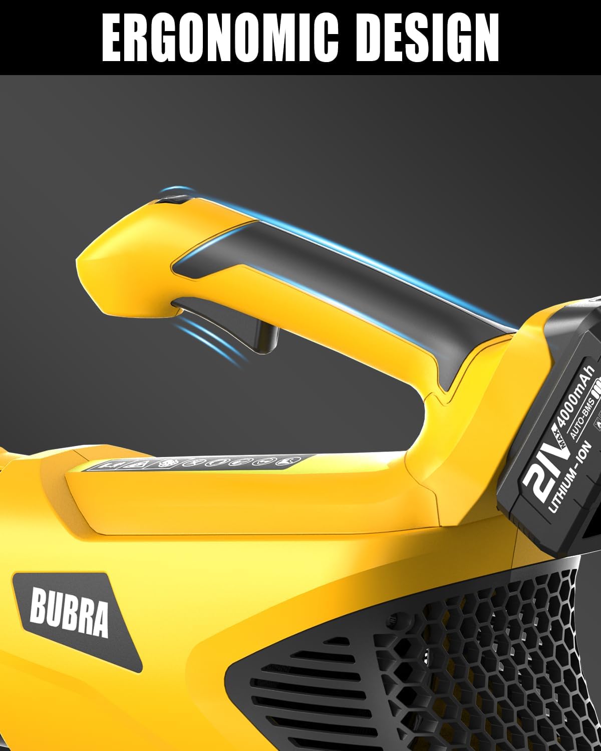 - BUBRA 21V Battery powered leaf blower ergonomically designed soft rubber grip is comfortable to hold. Cordless blowers with 5 speed adjustment, which can easily adjust the air volume according to different working scenarios, reduce power loss