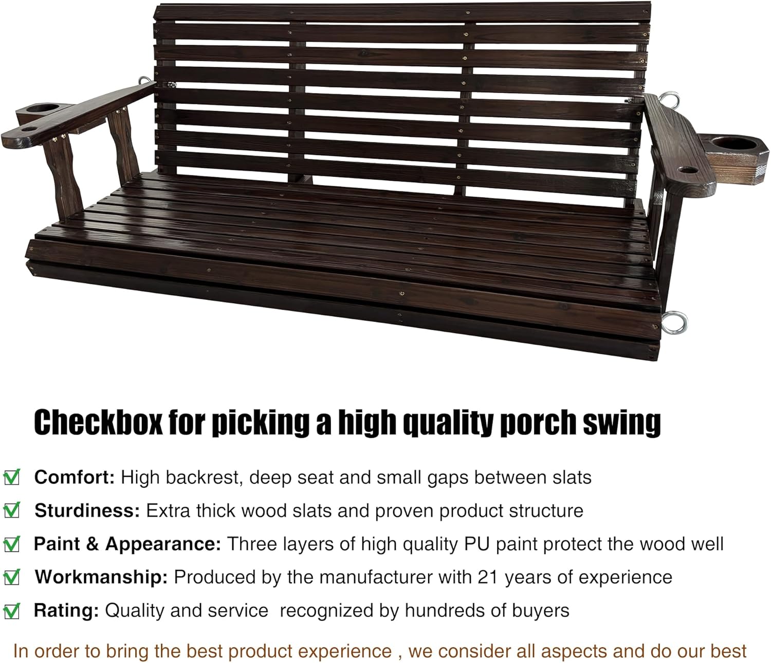 Fortune Candy Wooden Porch Swing 3-Seater, High Backrest and Deep Seat, Bench Swing with Cupholders, Hanging Chains and 7mm Springs, Heavy Duty 880 LBS (Deep Brown, 5 FT Extra Large)
