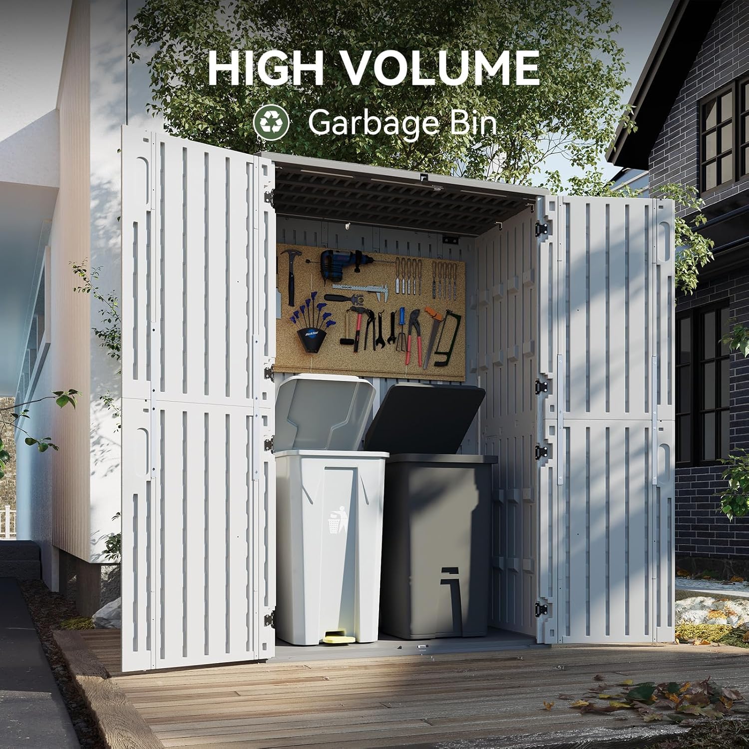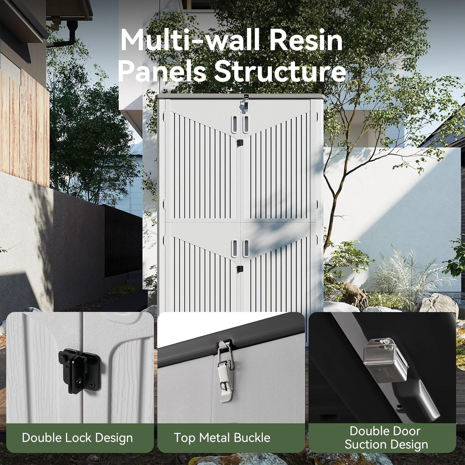 - 【Widened Anti-Toppling Base for Enhanced Stability】Designed with a widened bottom, this storage shed ensures superior stability, even on uneven ground. The top and bottom door suction system prevents accidental opening or closing, guaranteeing safety and durability during frequent use.