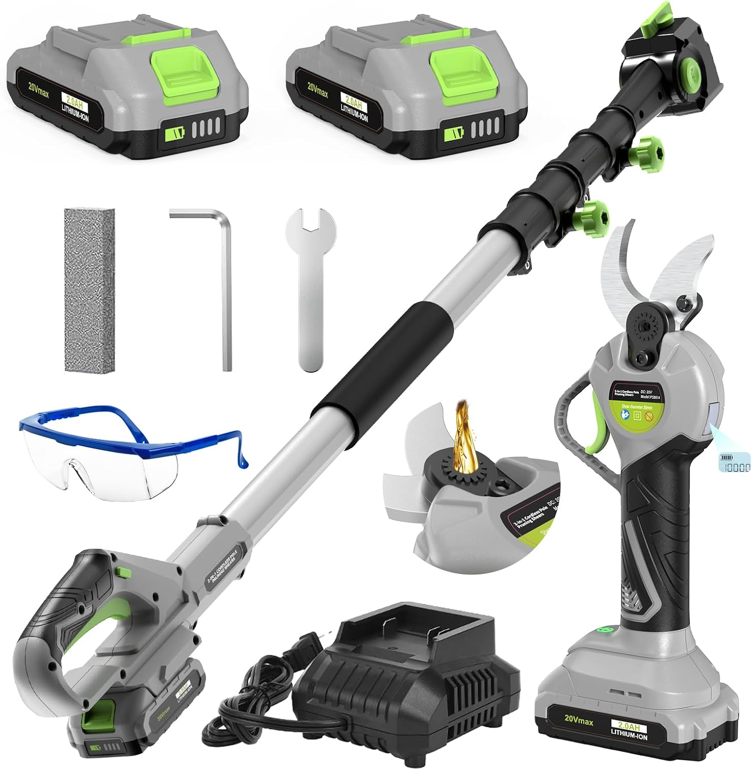 2 In 1 Pole Pruning Shears Cordless (2025 Upgraded), Electric Pruning Shears with LCD Display, 30mm Cutting Diameter Pole Pruners for Tree Trimming, with 2 Pack 2.0Ah Batteries and Goggles