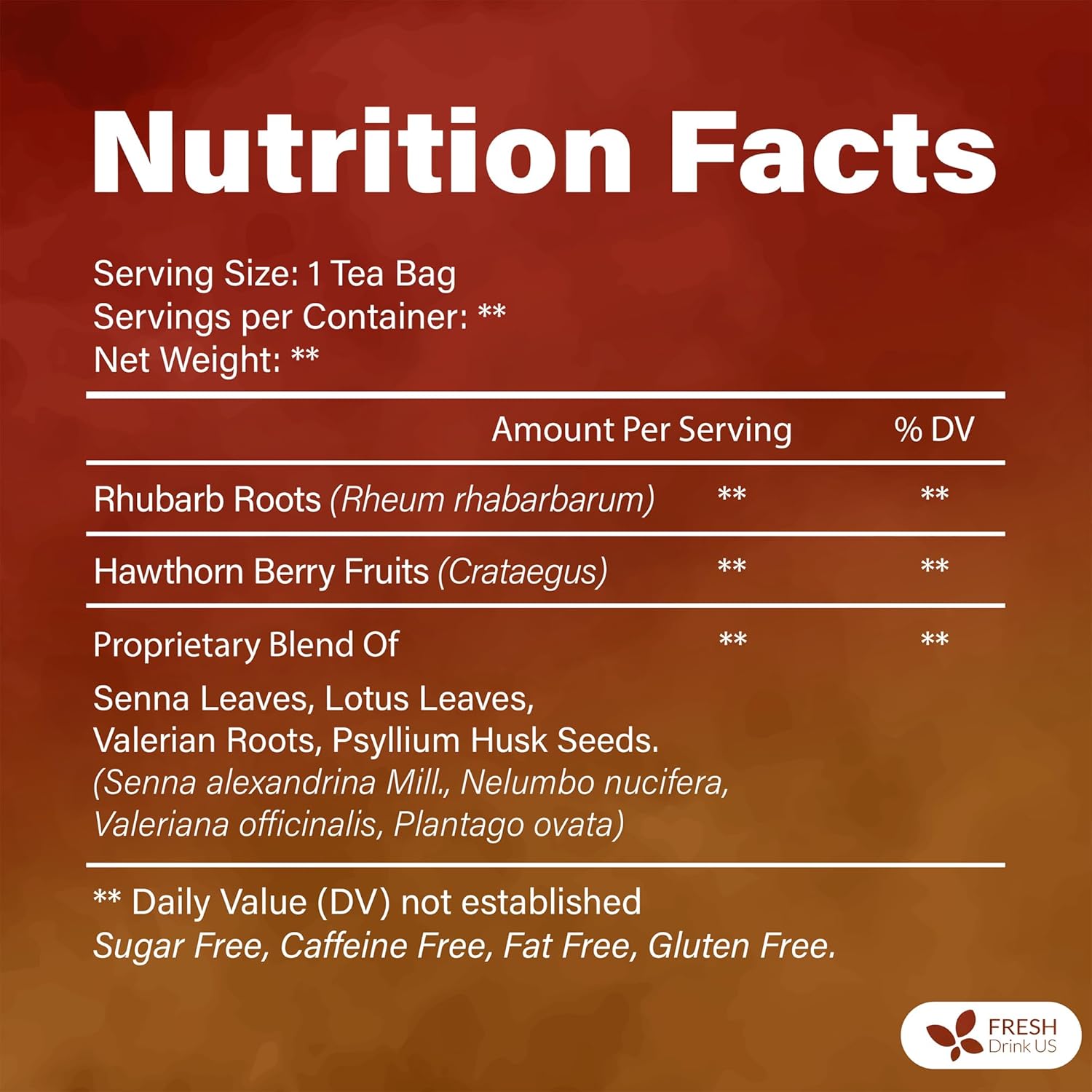 FreshDrinkUS, Premium Colon Cleanse Tea ā 60 Tea Bags ā Rhubarb Root & Hawthorn Berry with Senna, Lotus Leaf, Valerian Root & Psyllium Husk ā Herbal Blend, Caffeine-Free. Vegan