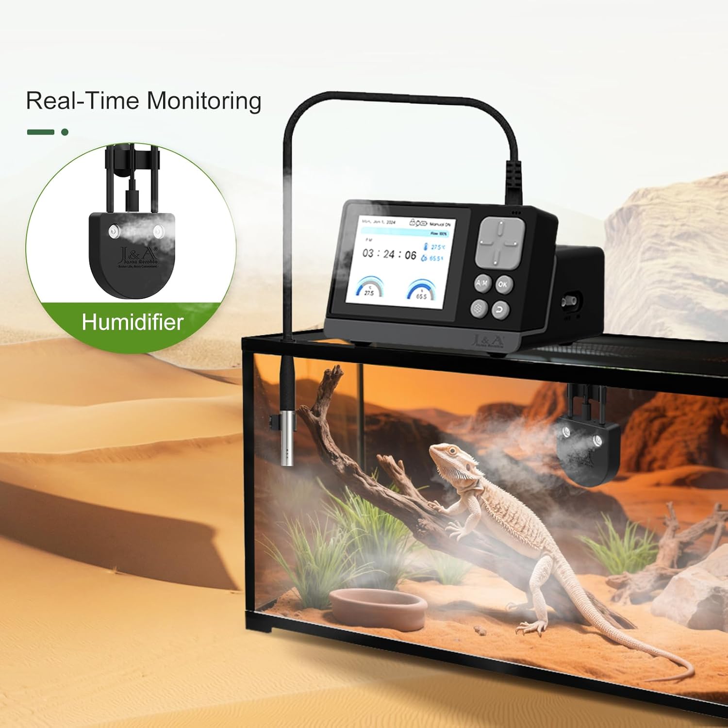J&A Automatic Fogger for Reptile Tank, Mister for Terrariums, Humidifer with Programable Timer, Temp-Hygrometer Sensor, Ideal for Amphibians/Reptiles/Paludarium/Vivarium (Black)