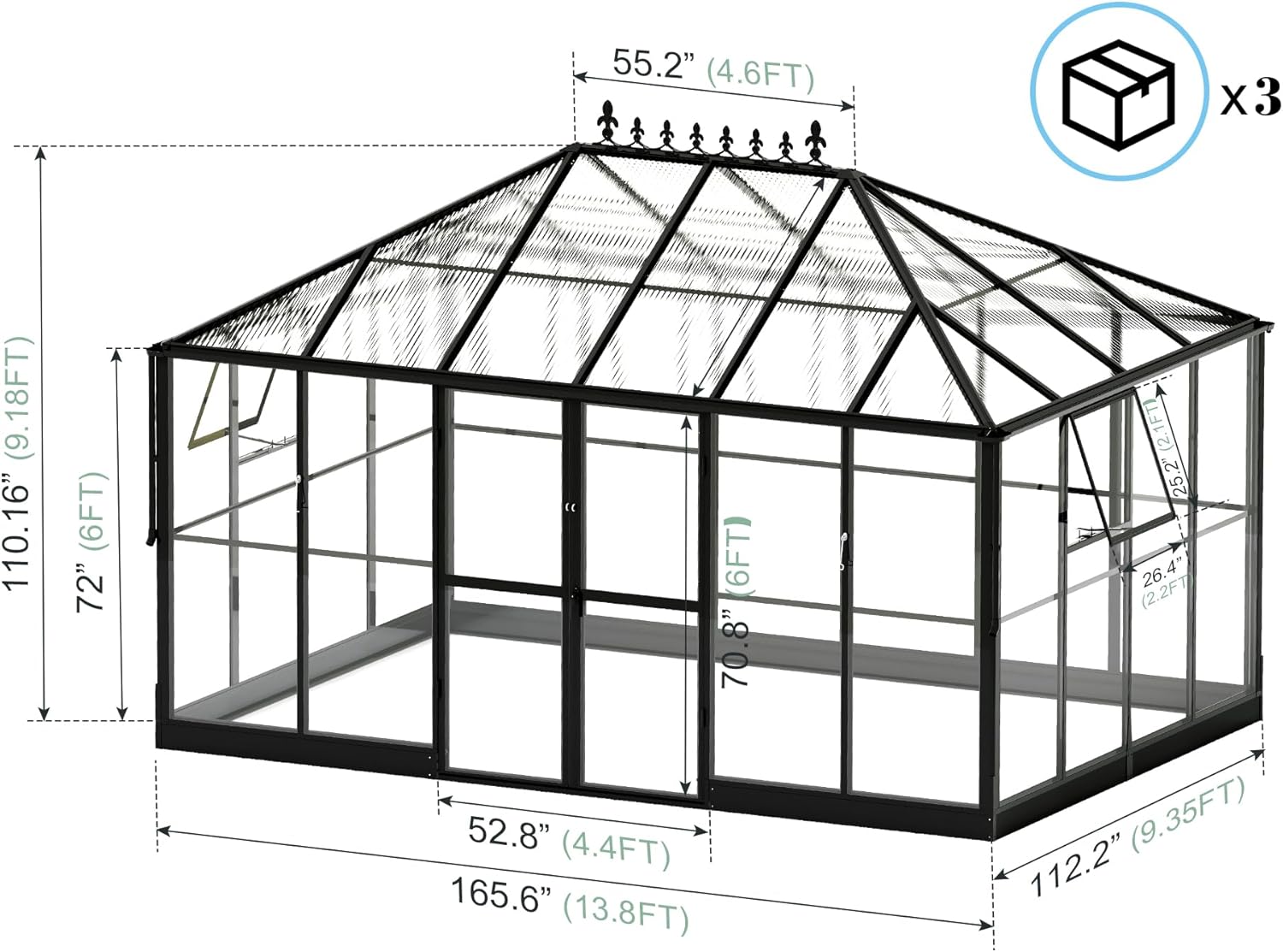 - 【Versatile Space】850 cu. Ft. to create a perfect warm environment for your personal plants. Transform your polycarbonate greenhouse into a functional living space by adding furniture. Exclusive design patent & a spear-like top discourages bird perching. Recommended to build a 15x10.5 FT foundation for it