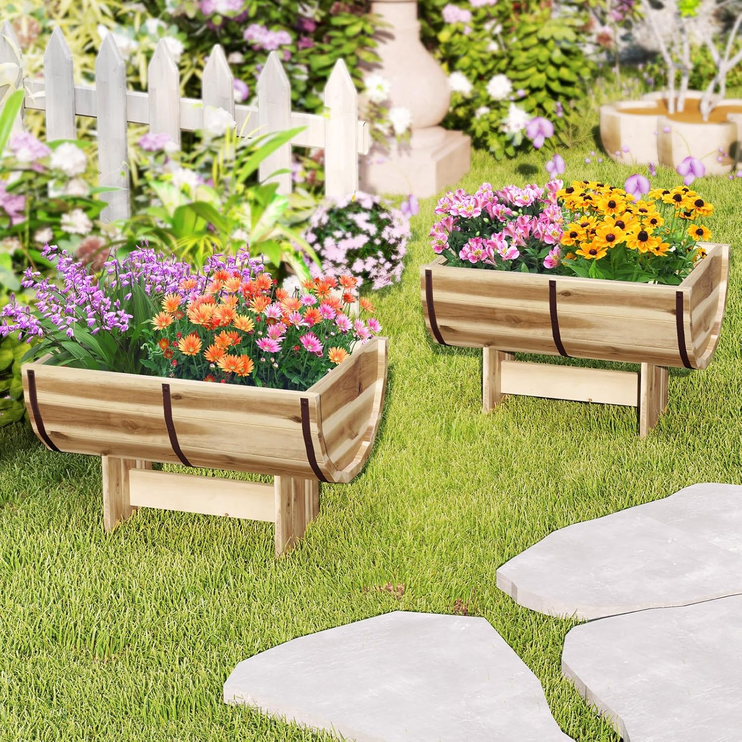 - Enhanced Stability: This decorative wooden half-barrel plant pot is secured with reinforced metal bands to enhance overall strength, preventing deforming or cracking, while the elevated base ensures it stable and well-supported.