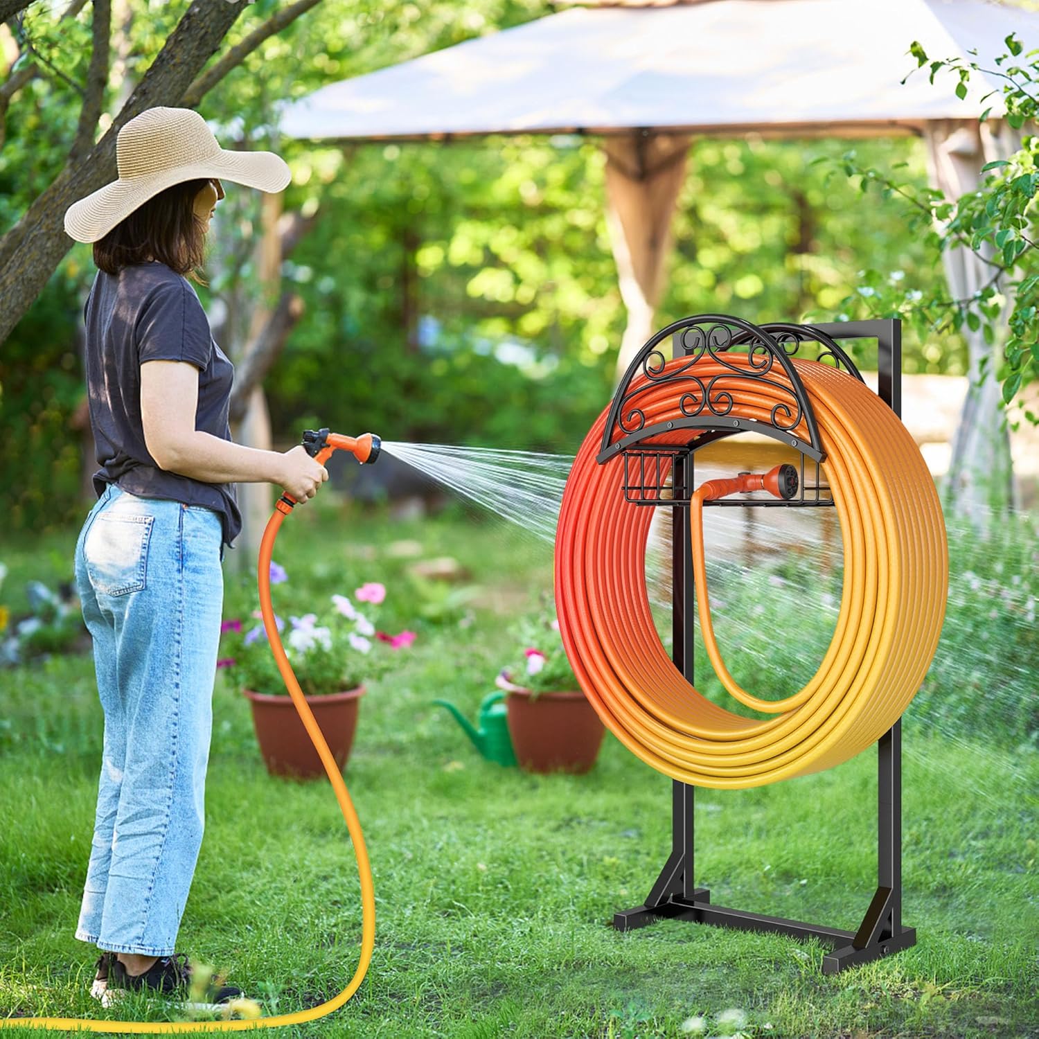 - 【Durable & Weather-Resistant Construction】Made from heavy-duty steel with a protective powder-coated finish, this outdoor hose stand resists rust, corrosion, and wear from sun, rain, or snow. Built to withstand the elements, it provides reliable, long-term use in any outdoor setting.