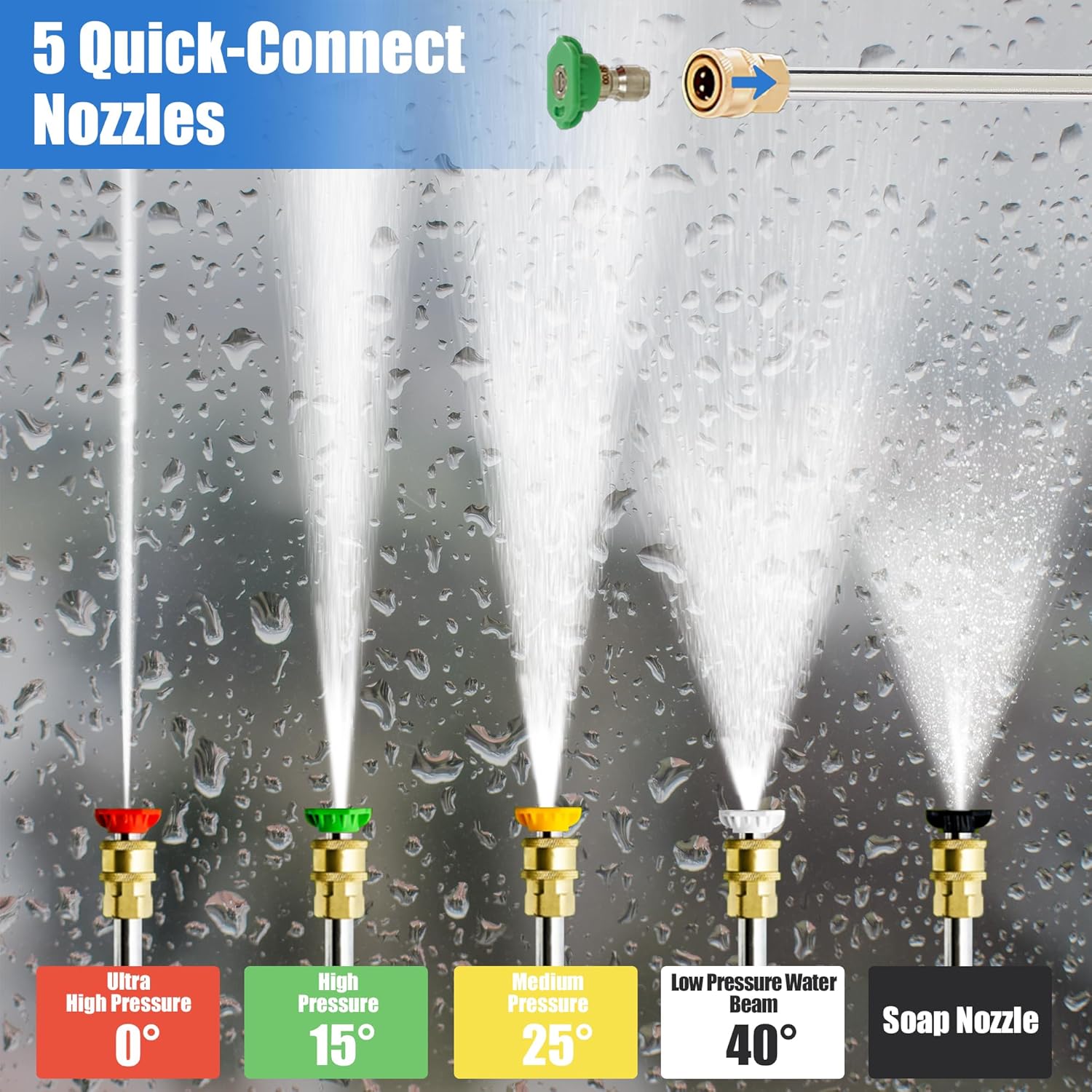 - ๐๐๐ซ๐ฌ๐๐ญ๐ข๐ฅ๐ ๐๐ฅ๐๐๐ง๐ข๐ง๐ ๐๐จ๐ฅ๐ฎ๐ญ๐ข๐จ๐ง๐ฌ โ This gas power washer includes 5 quick-connect nozzles (0ยฐ, 15ยฐ, 25ยฐ, 40ยฐ, soap) to tackle any task. Switch from precision stripping to gentle rinsing in secondsโideal for patios, grills, fences, vehicles, or pre-paint prep. Conquers grease, mildew, and debris with unmatched speed.