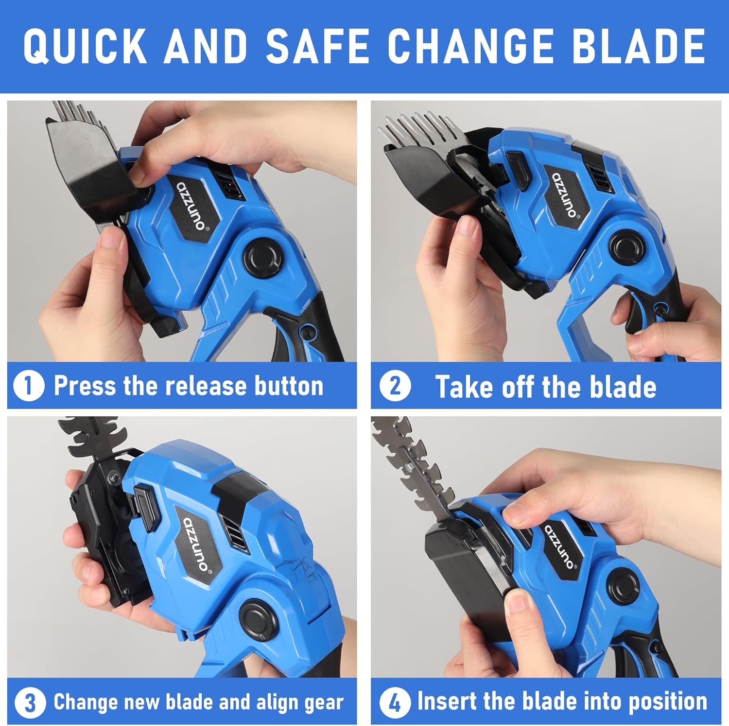 - 【Cordless Design Flexible Operation】The AZZUNO cordless hedge trimmer comes with removable lithium-ion battery (20V 2000mAh), allowing you to say goodbye to tangled cords. Fully charged in just 2 hours, each battery provides up to 45-60 minutes of runtime, letting you trim anywhere without needing a power outlet or extension cord. Perfect for reaching every corner of your garden and boosting your work efficiency