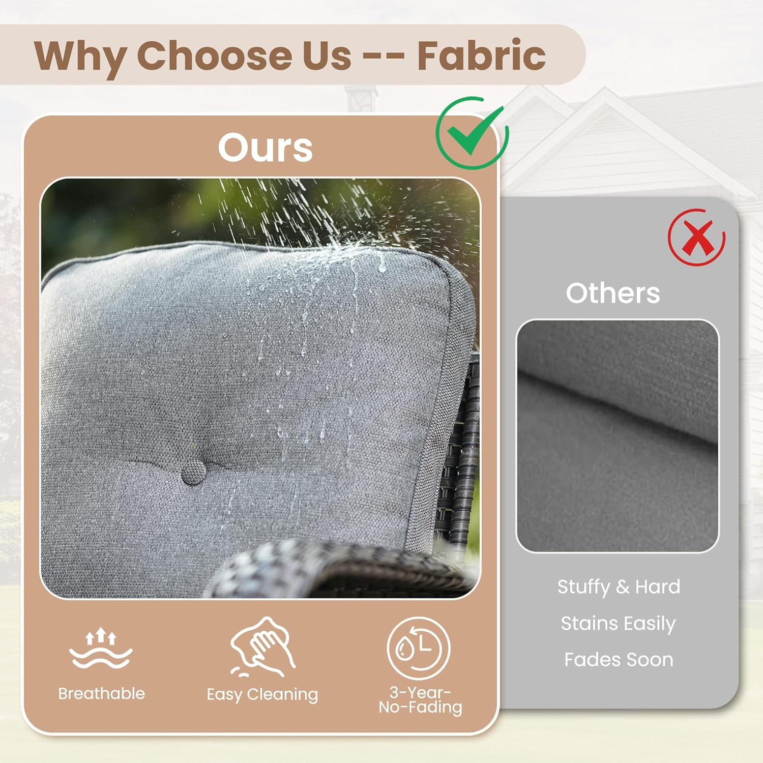 - Texture Woven Fabric: Cushions are covered by yarn dyed woven fabric, the yarns are dyed and UV treated before woven into fabric for out door fading resistant and water repellent. Looks and touches with high-end woven texture. No more worry about getting cheaply made thin print fabric. Detachable & washable