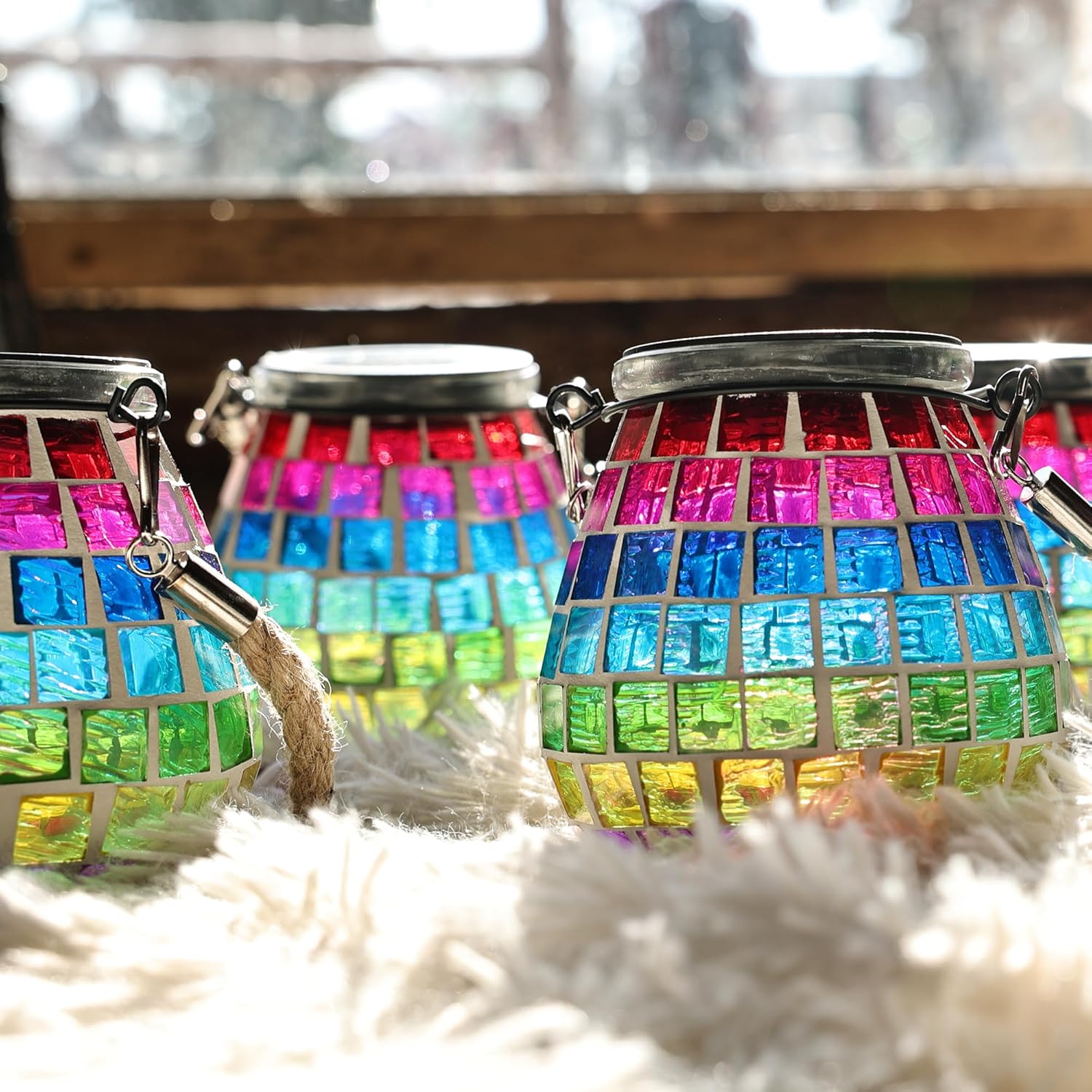 - 《Hang or Display—Your Way》Designed for versatility, it hangs securely from trees, fences, or hooks with its sturdy jute rope and iron loop—or sits beautifully on tables, steps, and railings. Whether swaying from a branch or lighting up your balcony, it fits in effortlessly.