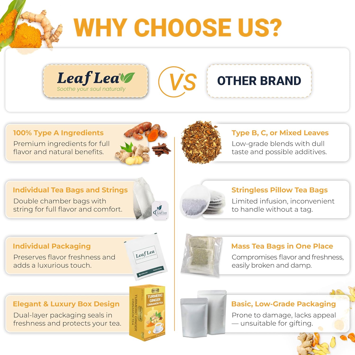 LeafLea 240 Turmeric Ginger Tea Bags, 100% Natural Herbal Blend with Cinnamon, Supports Digestion and Immune Health, Warm and Spicy Flavor, Sugar-Free, Caffeine-Free, Non-GMO, Pack of 6