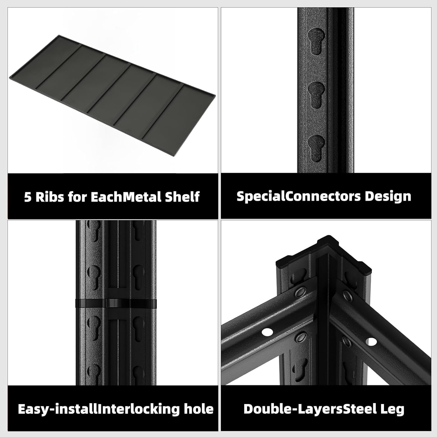 - 5 Tier Metal Shelf Unit: The garage shelves are constructed with reinforced, double-layered uprights that deliver exceptional load-bearing capacity, ensuring long-term use and stability. Each shelf incorporates 5 reinforcing rods and 1 support ribs at the back, enhancing stability and ensuring even weight distribution for the safe storage of heavy items.