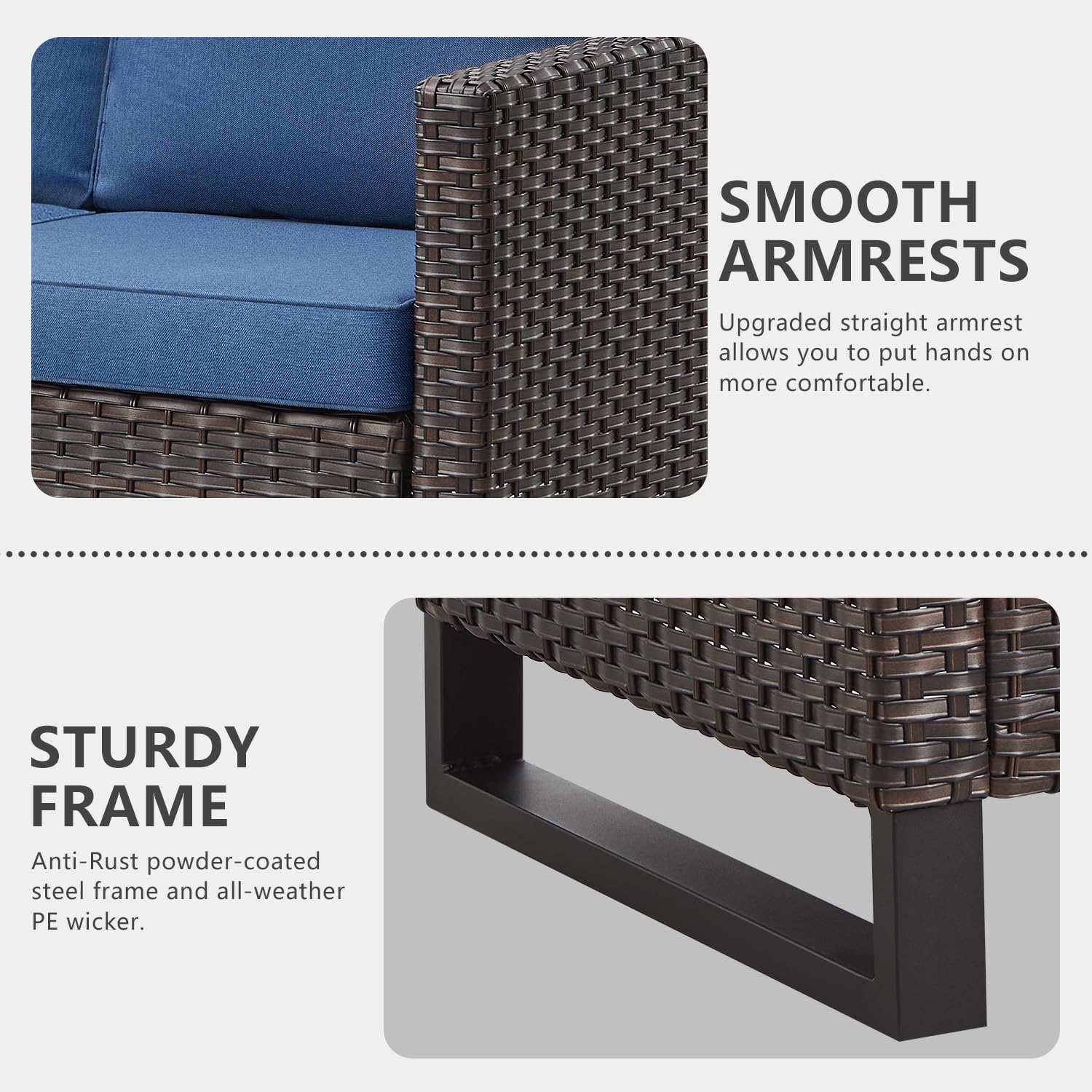- 【Comfortable 4'' Thick Cushions】This garden furniture set features deep and wide seats with 4-inch thick sponge-padded cushions.Offers good resilience, not easy to deform or slide, also protect your lumbar and offer a comfortable sitting experience,Water-repellent polyester cover with zipper,Easy to clean and keep.