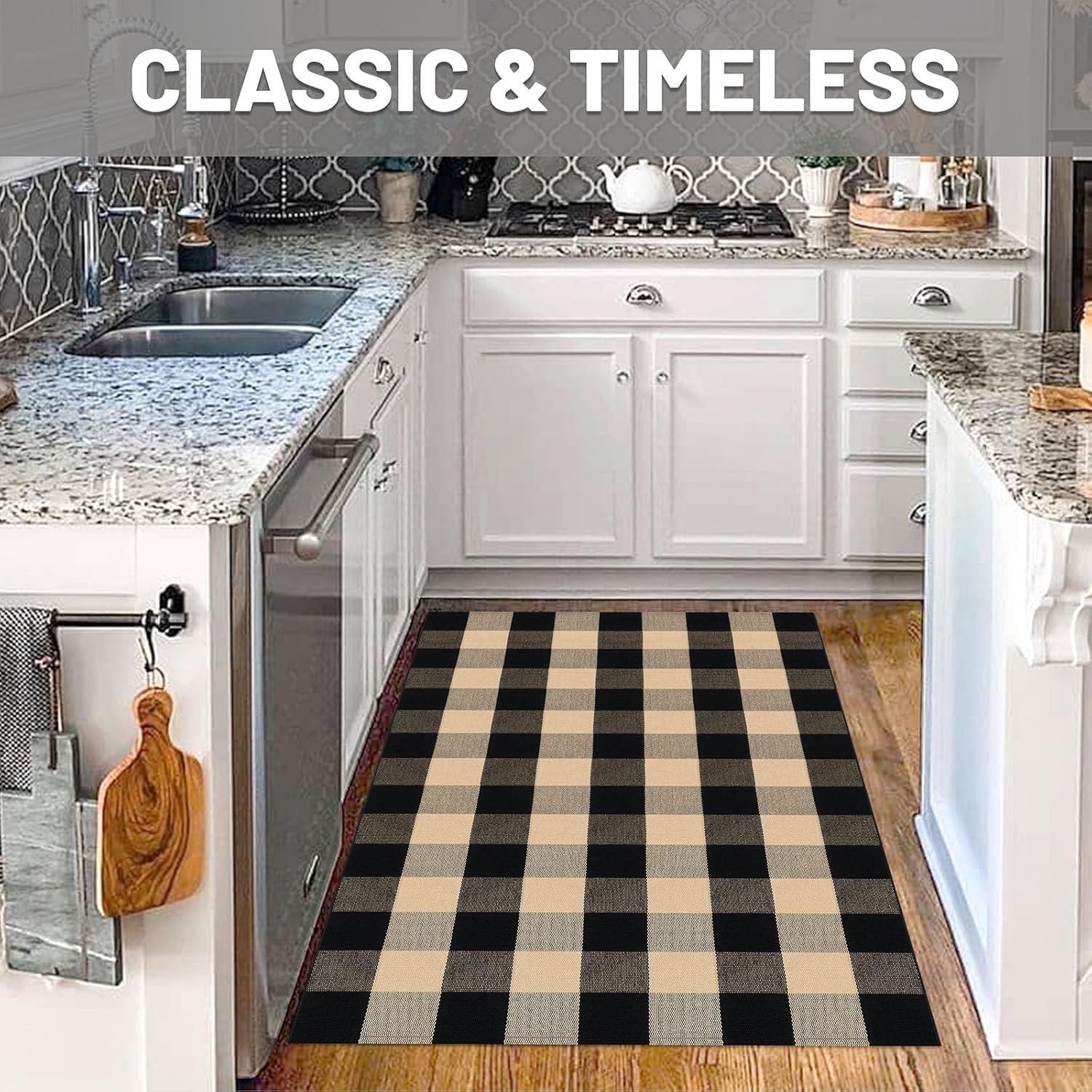 - Easy to Clean: This tan and black checkered rug is simple to maintain with machine wash or vacuuming to remove dirt. The rug is sturdy and can be tumble dried on low. Keep your door rug fresh and clean with minimal effort. NOTE: Cotton rugs normally shrink slightly after washing