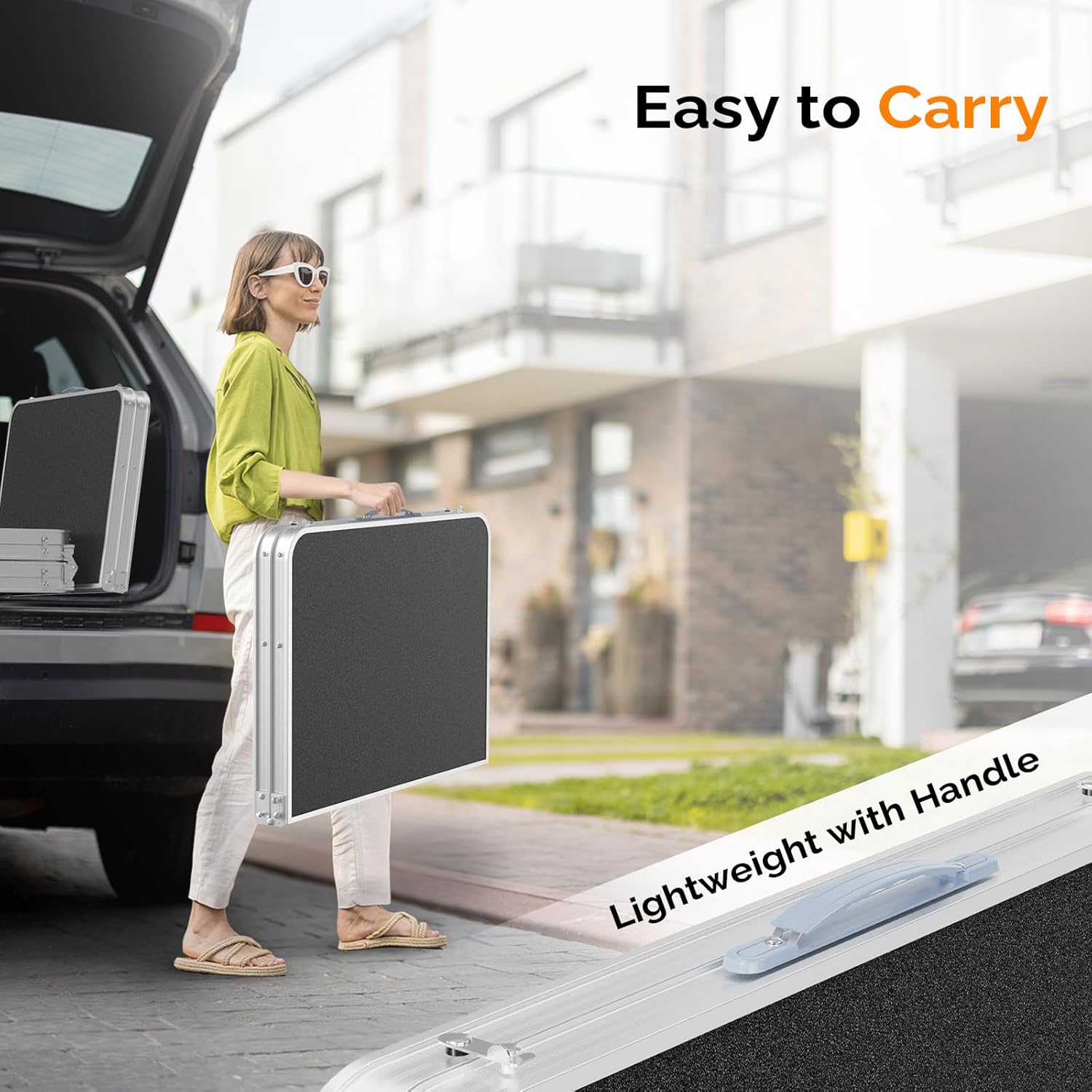 - LIGHTWEIGHT&FOLDABLE: MDF tabletop and aluminum feet make its weight just 8.1 lbs. The feet could be set off and tabletop could fold in half, foldable like suitcase(23.6”*17.7”). It is convenient to carry it to anywhere with its soft carry handle.