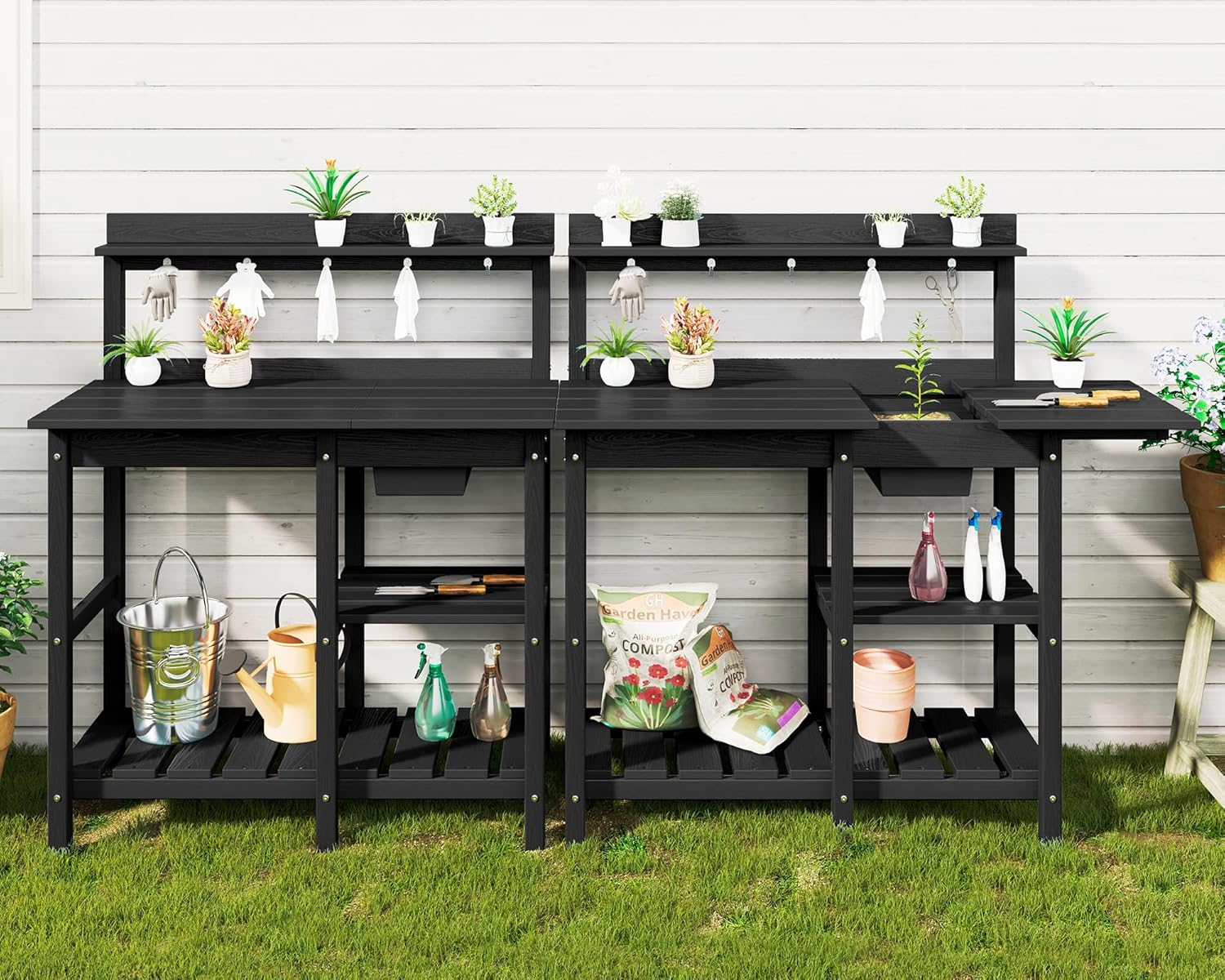 SERWALL Potting Bench Set of 2 Outdoor Potting Table with Sink, HDPE Potting Benches for Outside Gardening Table All Weather Use- Black