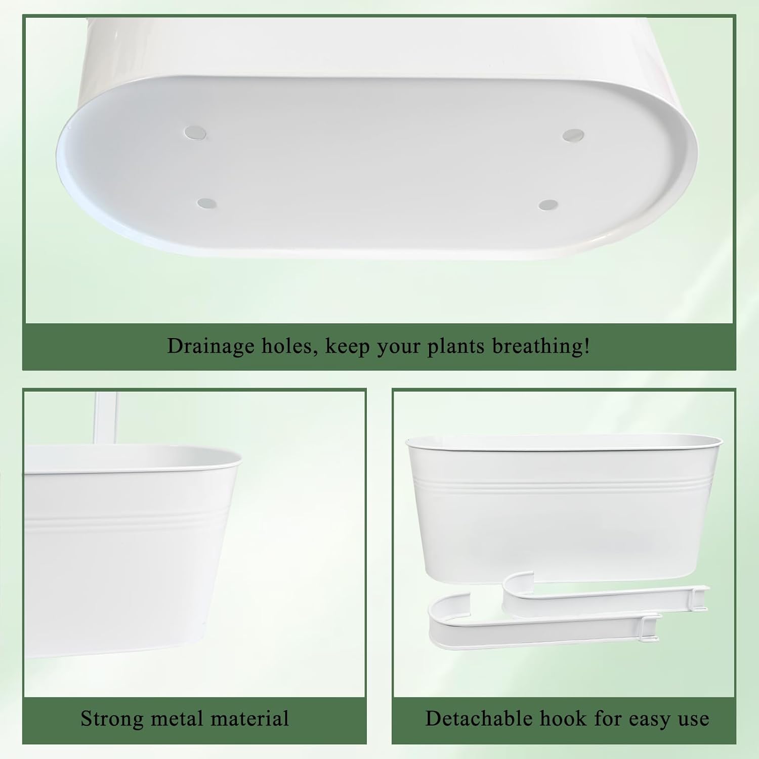 Hanging Planters for Outdoor Plants, 17" Railing Planter Pots, Metal Fence Flower Pot for Porch Balcony with Detachable Hook (White, Pack of 8)