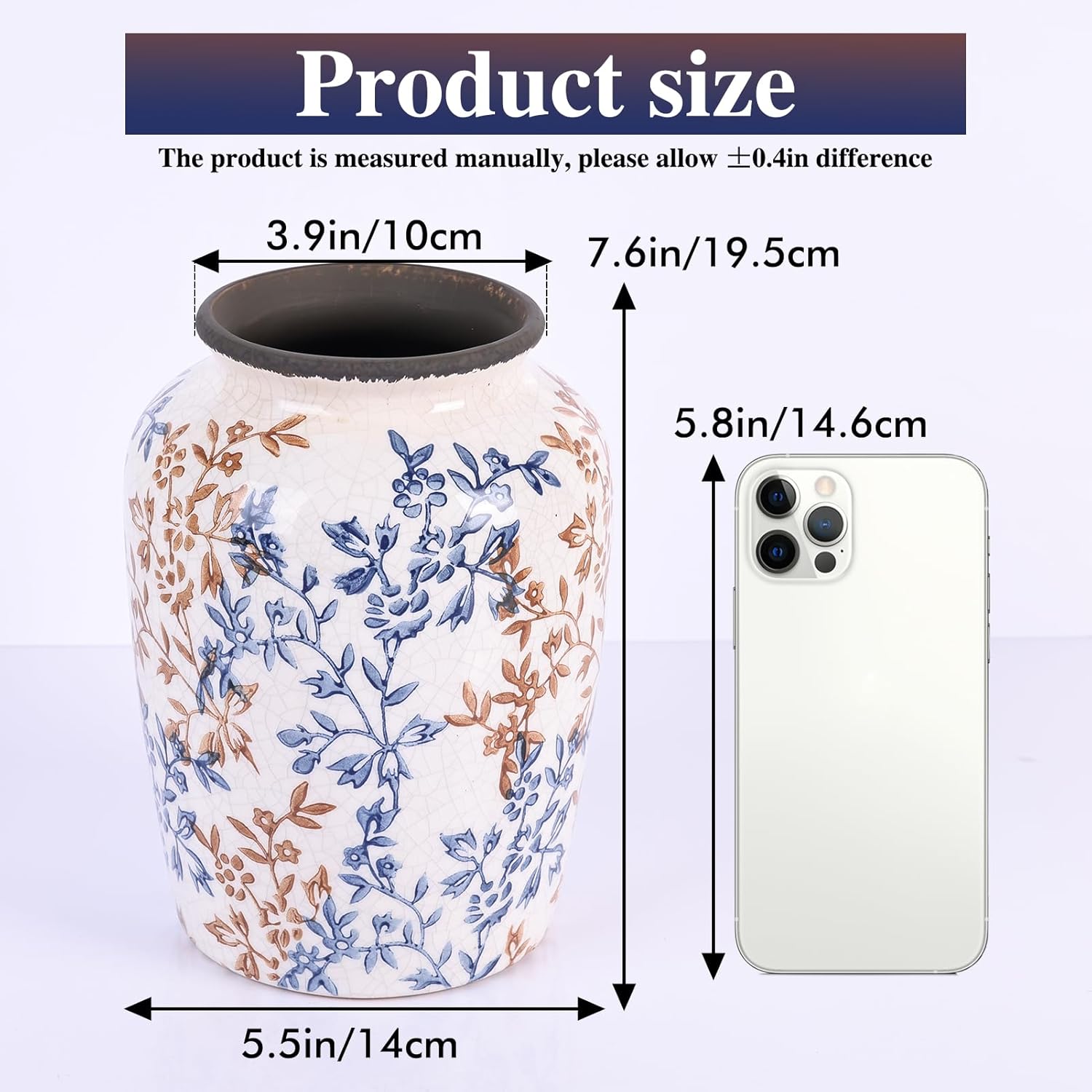 - Rustic flower vase: This porcelain vases measures approximately: 8.3 inches high, 5.5 inches in diameter/21*14 cm, can be used to display fresh or artificial flowers on shelves, mantels, tables or other surfaces, adding charm to living rooms, dining rooms, bedrooms, etc.
