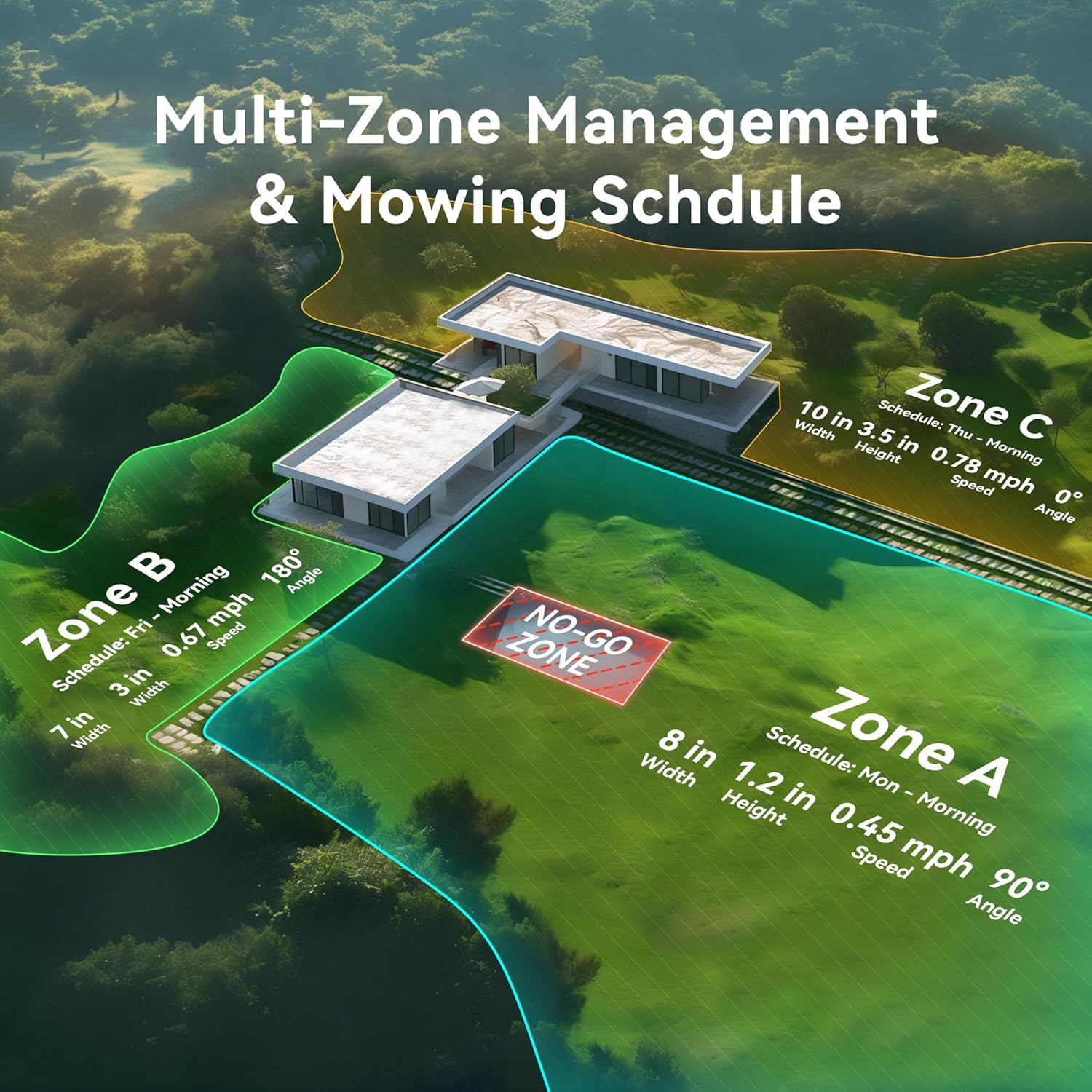 - 【1 Acre. Yes. Just One Mower】Thanks to powerful vision and spatial fusion technology, the mower can "understand" its surroundings like human eyes. It supports edge mapping of up to 1 acre (43,560 sq.ft / 4000㎡) and ensures consistently centimeter-accurate positioning. Users can customize multiple working areas via the app and define no-go zones such as pools, flower beds, and play areas, all of which are accurately recognized. Daily lawn care becomes effortless with the schedule function.