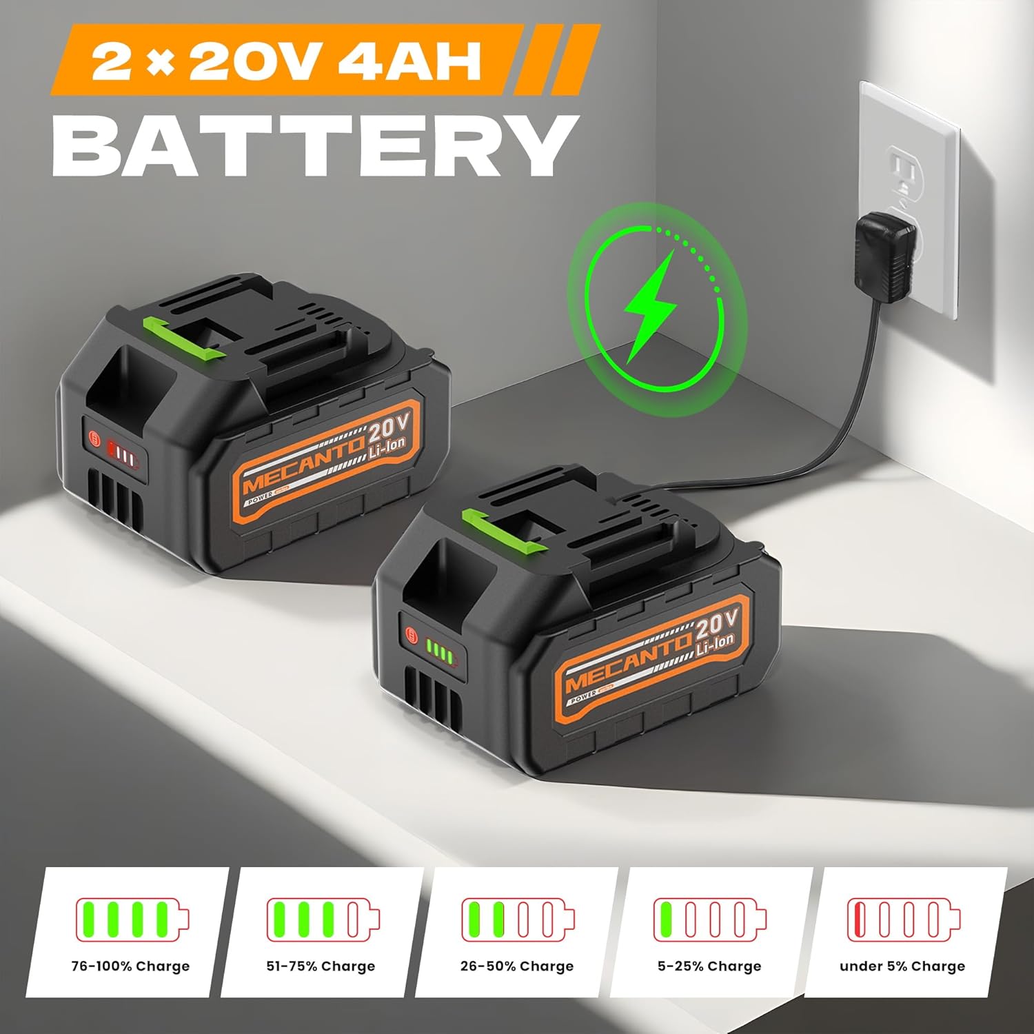 - 🍂Twin Battery System + Rapid Charging🍂Includes ​two high-capacity 20V/4.0Ah lithium-ion batteries, this electric cordless leaf blower providing ​up to 30 minutes max-speed runtime​ for continuous multi-zone use. Features a ​1.3-hour fast charger​ and ​4-stage LED indicator​ (Green: Full / Red: Charging).
