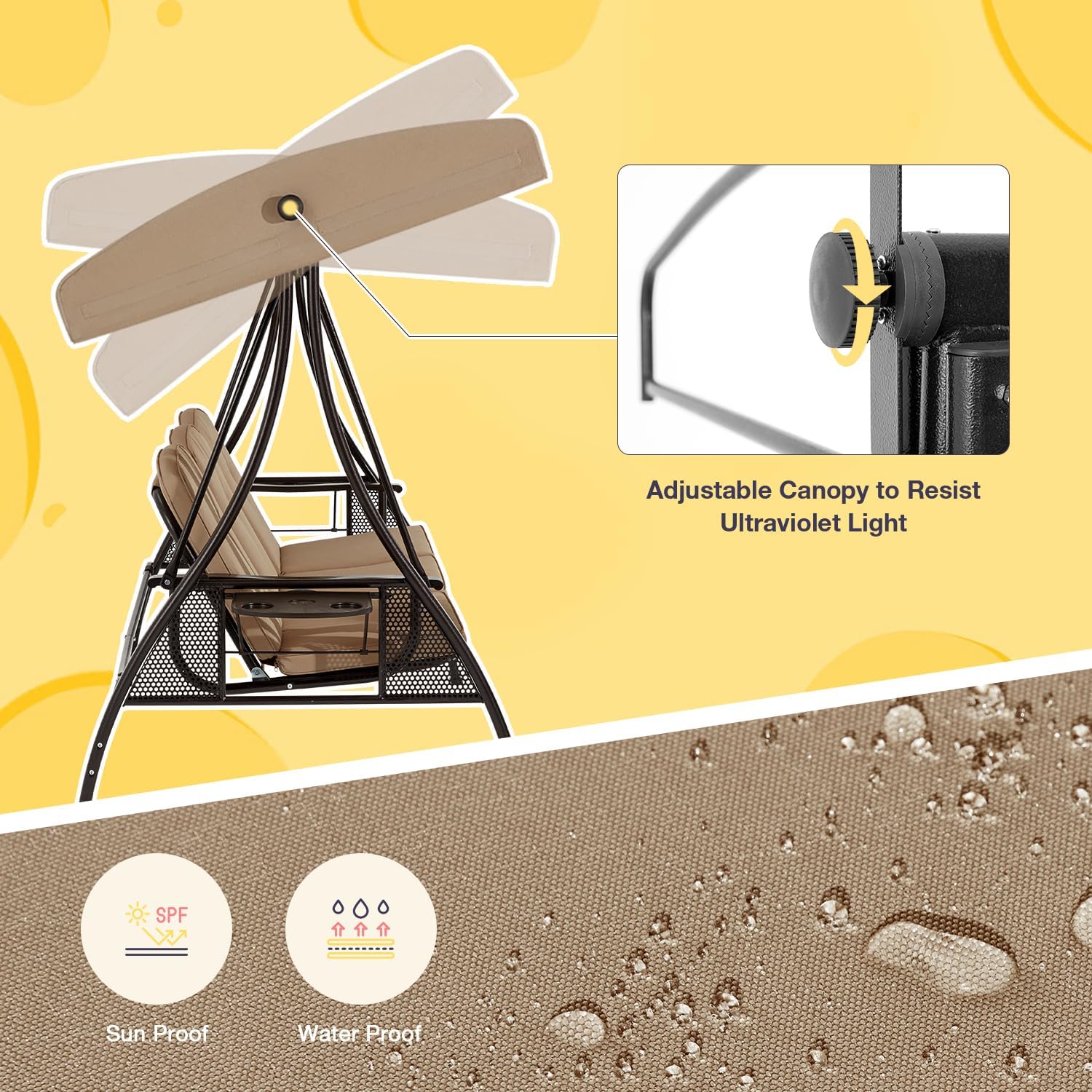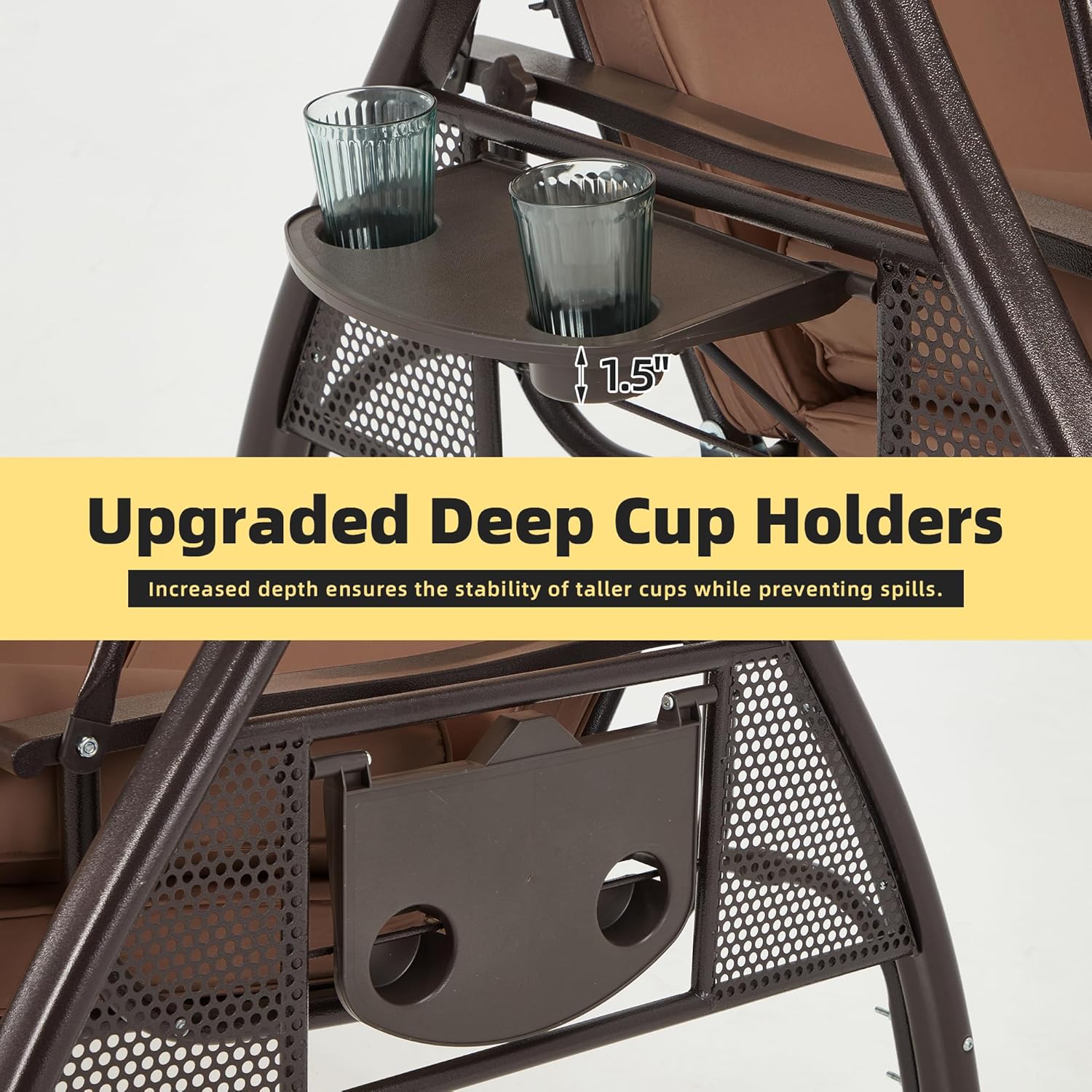 HOMREST 3 Person Outdoor Porch Swing with 1.5" Upgraded Cup Holder, Adjustable Canopy, Backrest, Patio Swing Bed with Weather Resistant Steel Frame, Cushions for Garden,Deck and Poolside(Brown)