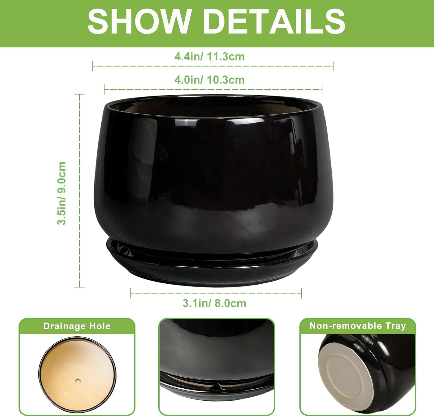 - Dimensions: The waist diameter of these ceramic plant pots is 4.4"/ 11.3cm, the external caliber is 4.0"/ 10.3cm, the height is 3.5"/ 9.0cm. This black planter is an ideal choice for growing succulent plants, cacti, aloe vera, orchids, snake plant, african violet, mint, rosemary, herbs, and other indoor & outdoor plants