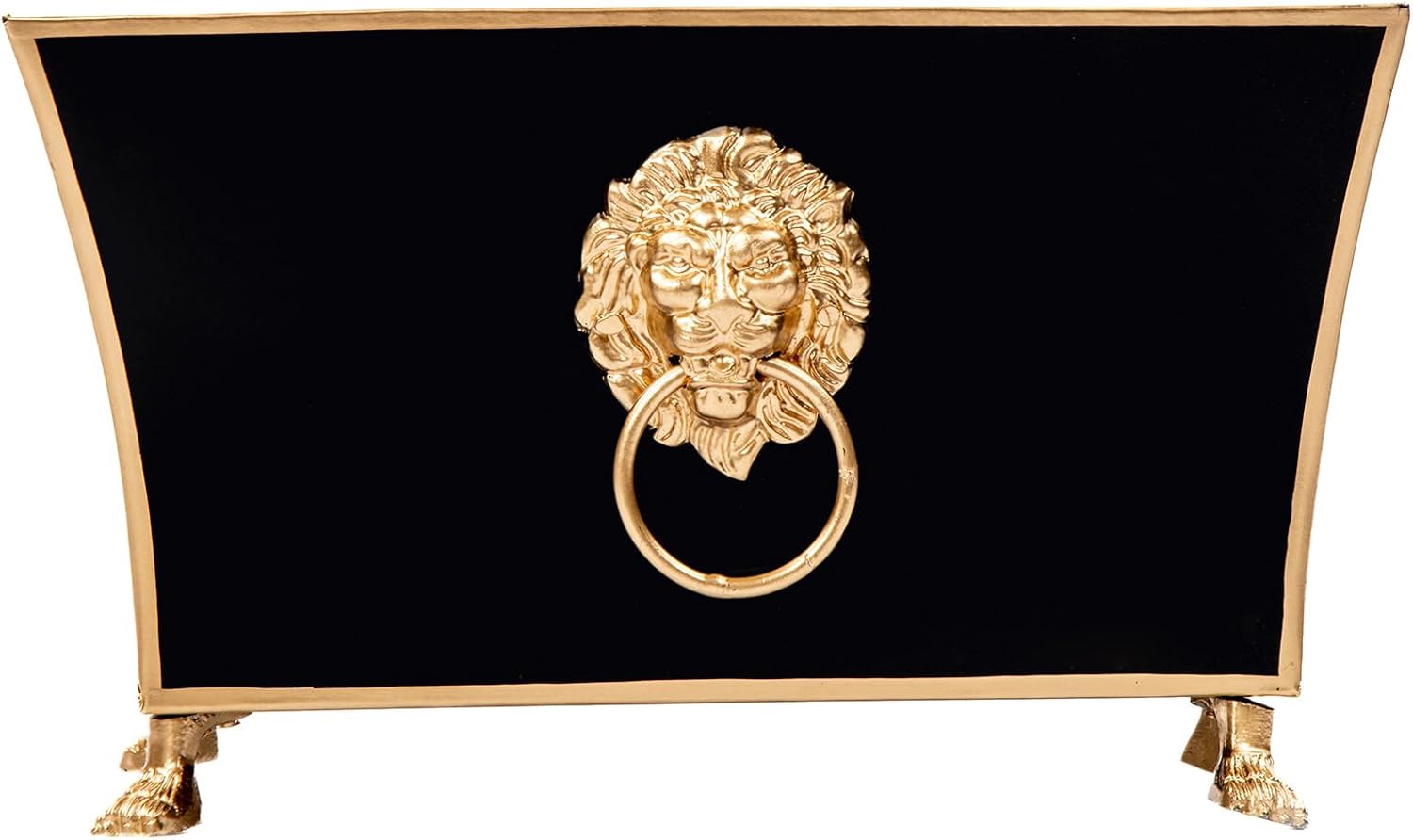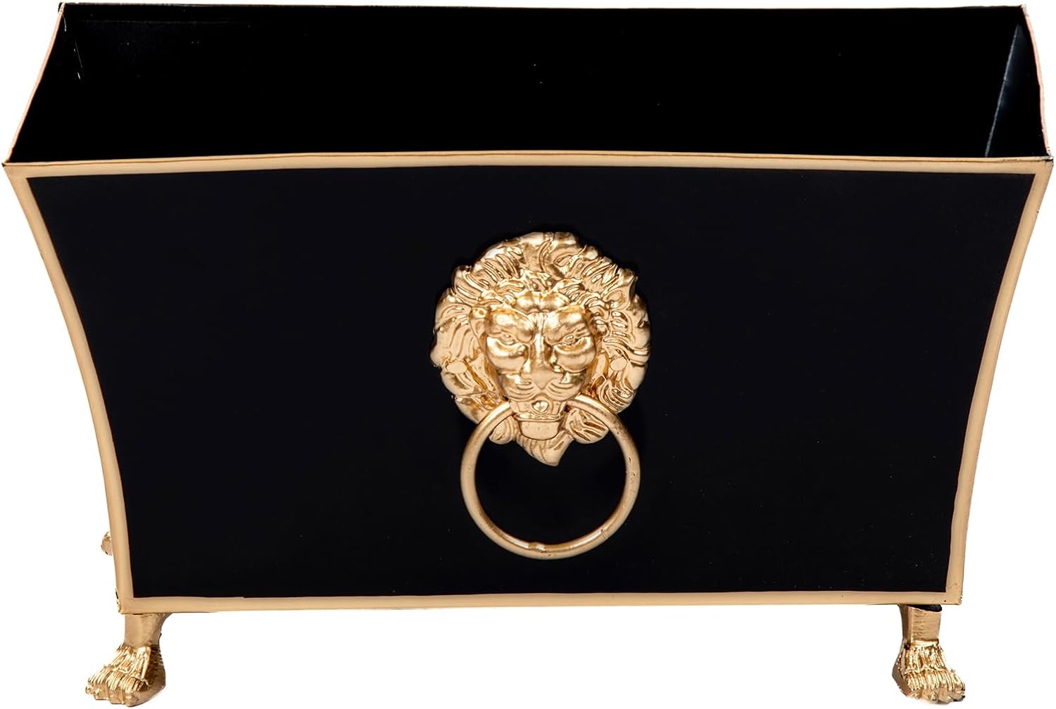 - Modern Statement Cachepot with Gold Detailing | Add power and poise to your space with this horizontal black metal cachepot from the Paws and Claws Collection. Featuring a hand-carved lion emblem, gold trim, and fluted sides, this black planter blends decorative detail with symbolic design.