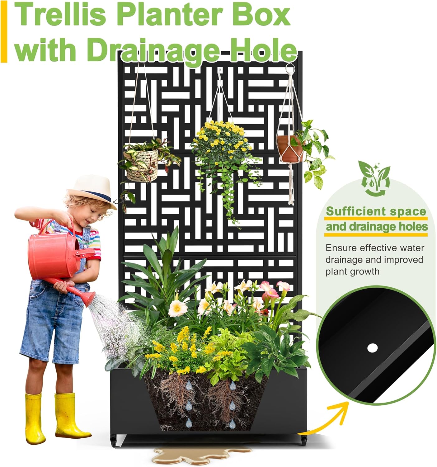 • 【Planter Box with Drainage Hole】Designed with a 12” deep planting bed and equipped with drainage holes at the bottom, this planter box provides ample space for healthy plant growth, ensuring excess water can escape and preventing waterlogging.