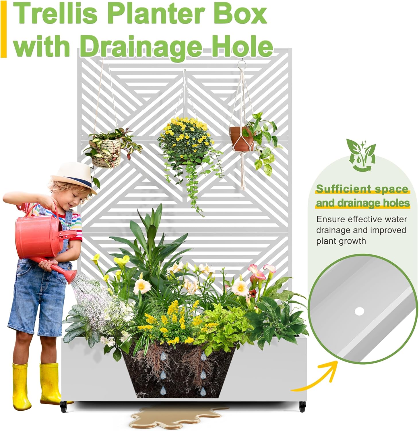 FENCY Metal Raised Garden Bed with Wheels and Trellis,73"x47"x16" Planter Box for Climbing Plants, Vegetables & Vines, Features Privacy Screen and Drainage Holes (White-Modern)