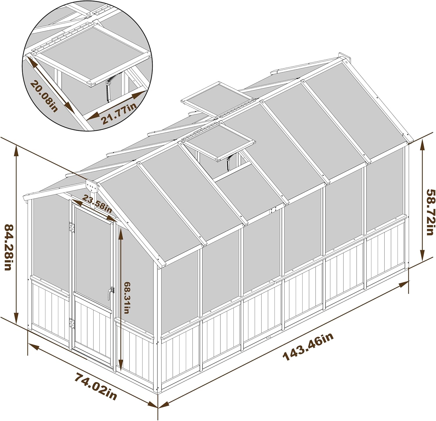 - ADJUSTABLE ROOF - Different from other greenhouses, the window of our polycarbonate walk-in greenhouse with adjustable poles for better ventilation, which can create an ideal growth environment for your plants. You can also customize the window to any roof panel according to your like. The 6’ x 12’ greenhouse has a large space that can accommodate enough plants and gardening tools, you can directly enjoy the fun of growing plant after assembly.