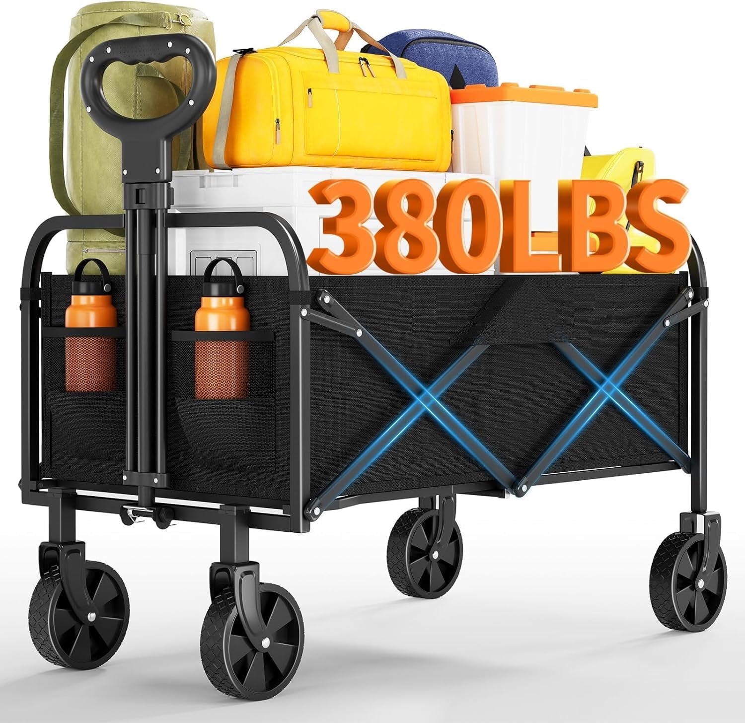 Foldable Wagon Cart, 380LBS Capacity Collapsible Wagon with All-Terrain Wheels, 220L Foldable Utility Cart & Grocery Cart on Wheels, Portable Lightweight 12LBS for Outdoor, Beach, Garden (Black)